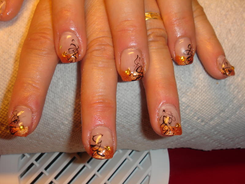 Une french pailleté orange ou avec un gel couleur métallisé , un strass ton sur ton et pour finir un liner noir