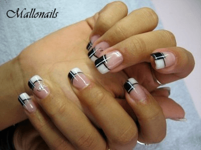 tu fais ta pose normal avec french et ensuite sur la construction tu mets le liseret noir puis la rectangle noir,puis les traits blanc. et pour finir gel de finition.