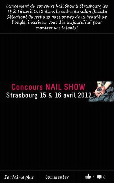 Nous avons le plaisir de vous faire part du lancement du concours Nail Show à Strasbourg les 15 & 16 avril 2012 dans le cadre du salon Beauté Sélection, sponsorisé par en Vogue, Peggy Sage, Nail Artists, Emmi-Nail