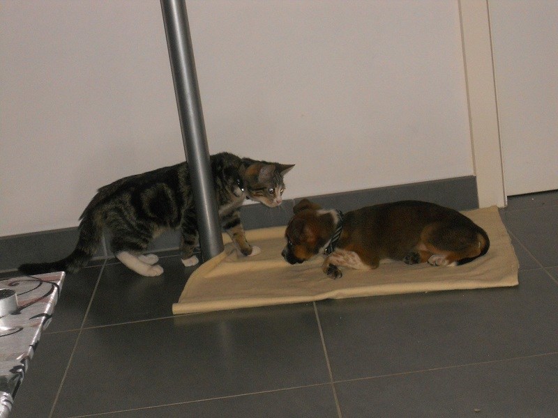 voilà j'ai un chaton de 5mois et je viens d'adopter à la spa un croisé american staff de 4mois une femelle... je viens de les mettre ensemble pour la première fois et ça ne se passe pas trop bien.. le chat crache et se sauve et le chiot aboie..