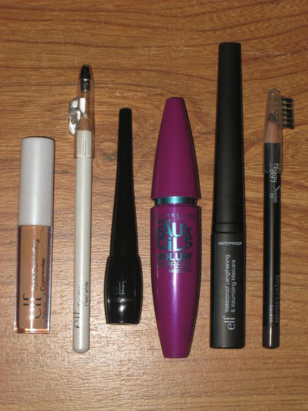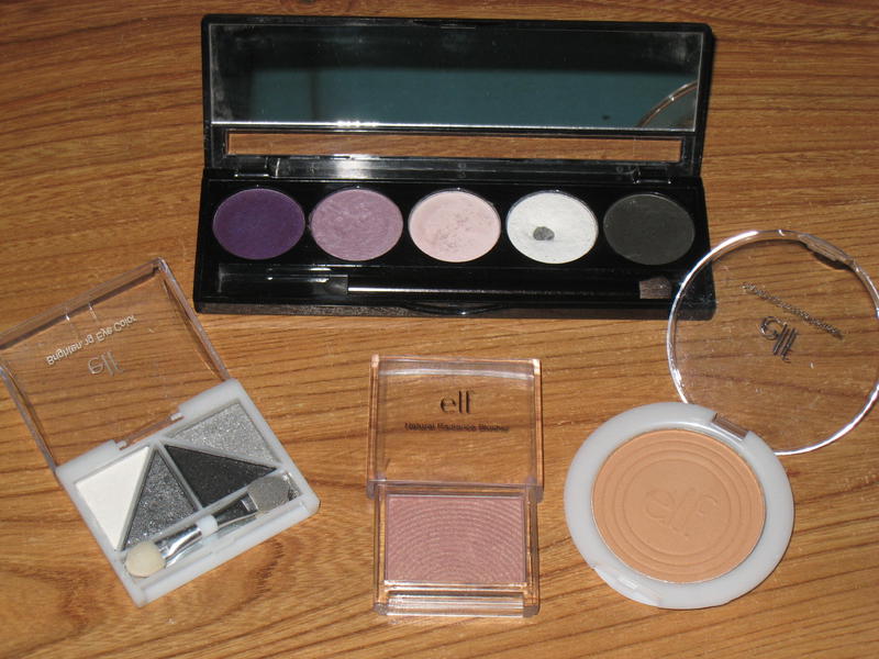 Donc palette de chez Fraulein 38°, pinceaux de chez Elf, palette de 5 fards de chez Peggy Sage, palette 4 couleurs de chez Elf (très bien pigmentée), blush de chez Elf (couleur effarouchée), poudre compacte Elf (tone 2), 3 paires de faux cils de chez Elf dont une avec strass (très jolie), 2 pinces à épiler, une de chez Elf et l'autre de chez Elite, feuilles matifiantes de chez Elf, recourbe cils Elf, applicateurs mousse Elf mais je ne les utilisent pas, eyeliner noir Elf, 2 mascaras, un de chez Elf et l'autre de Maybeline (j'adore le volume), un concealer de chez Elf, un crayon blanc Elf, un crayon sourcils de chez Peggy Sage.