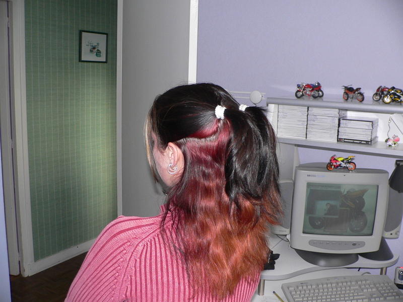 je ne suis pas fan du moitié moitié mais en noir et rouge avec cette coupe ci et tes cheveux nettement moins abimés, c'est carrement mieux!
