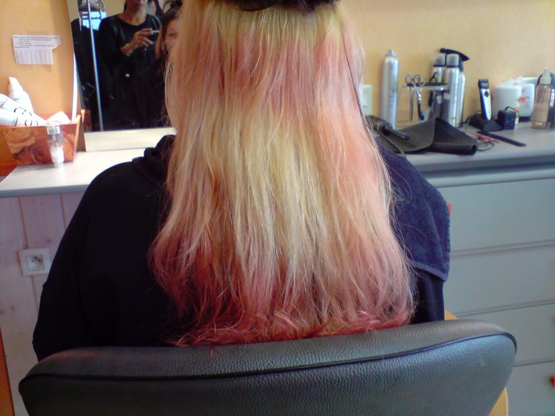 ba en fait la coiffeuse a fait son mic mac et vu que j'avais deja décaper mes cheveux y'a 3ans je ne voulais plus le refaire mais elle ne m'a pas trop laisser le choix .... de toute facon je suis obliger de passer par la case couper au moins 5 cm mais j'adore le rose et j'aurai voulu le garder ...... si je peux :)