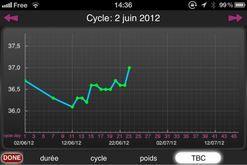 oui c'est compliqué tu devrai prendre une courbe sur maman&co c'est plus clair tu peux mettre tes symptome du moment et en plus elle détecte ton ovulation