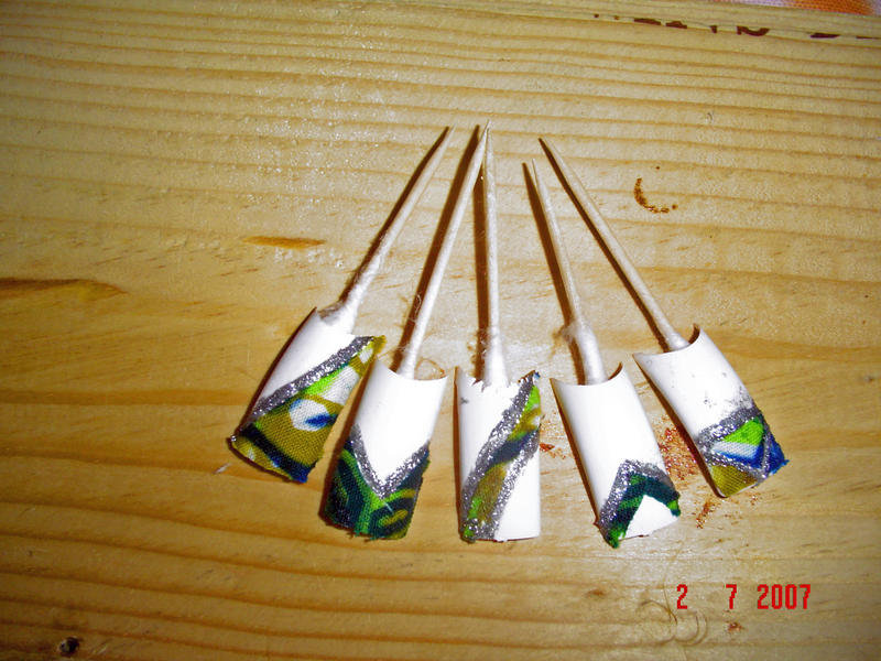 l idee d incorporer du tissu est exellente mais peaufine un petit peu ton travail , il manque juste d un peu de finesse. Prefere des soies, des satins, des tulles, des organzas au lieu de cotons tout simples. Et pour parfaire le tout choisies plutot des teintes plus douces. Deja que le tissu va alourdir ton ongle il faut absolument alleger avec des couleurs tendres.