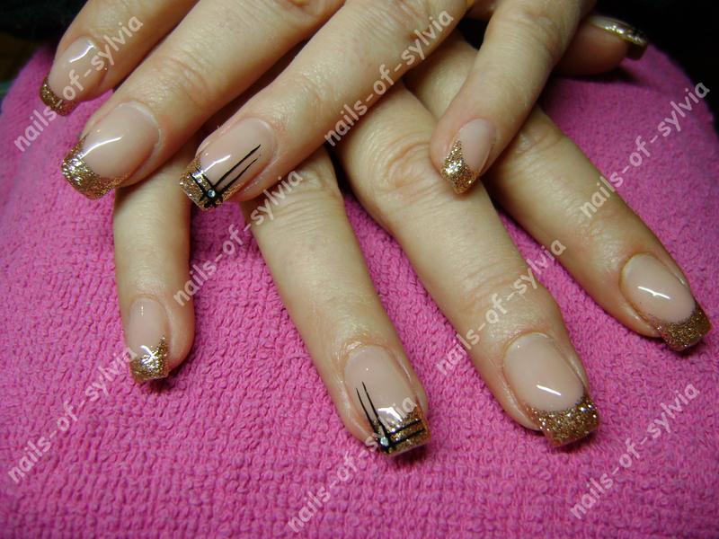 voila une de mes poses en doré pailletté (enfin c'est plus champagne) et noir,tu peux aussi faire une ligne noire et l'autre blanche. bisou