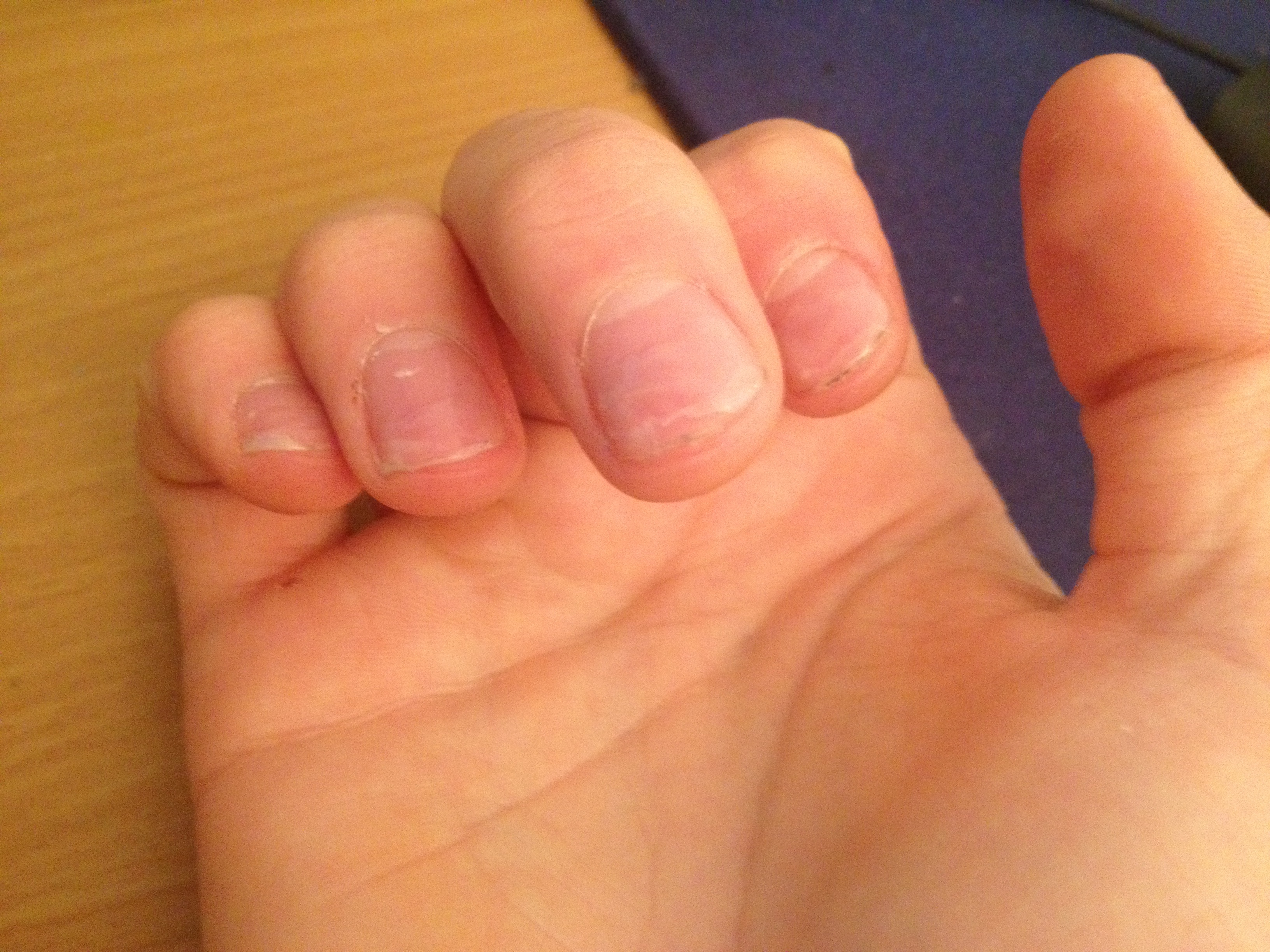 J'ai juste poncé un tout petit peu l'ongle avec une lime qui ponce pas beaucoup (super vocabulaire) nettoyé à l'eau, appliqué le ibd builder sur le bout de l'ongle, et j'ai fais ça 3 fois de suite pour avoir une couche correcte. Et ça ne tient pas, ça casse à l'endroit ou l'ongle percute les cordes. J'ai choisi gel uv car quand j'avais fait la résine, c'était super mais à la fin ça m'avait déchiré l'ongle, les différentes couches de l’ongle s'étaient séparées et c'était la cata.