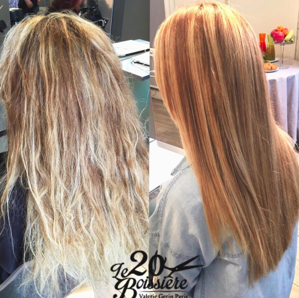 Le soin à la kératine, lissage français, répare et nourri les cheveux colorés et décolorés puisqu'il ne contient pas meme une petite dose de formol. 100% kératine. En image = longueurs réparées !