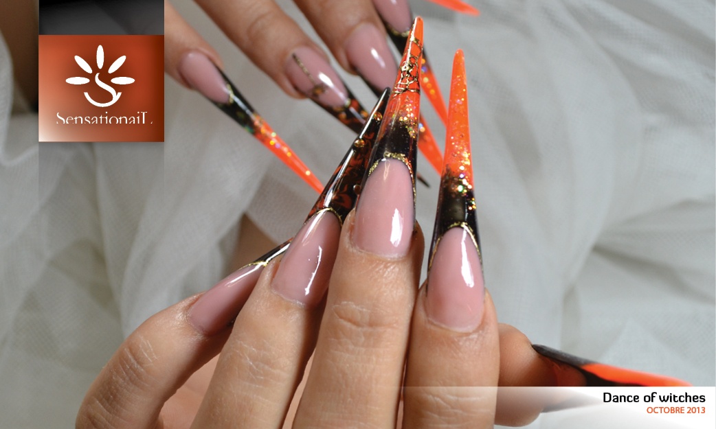 Décos : paillettes oranges, studs orange-gold holographic et gel paint noir et foil or
