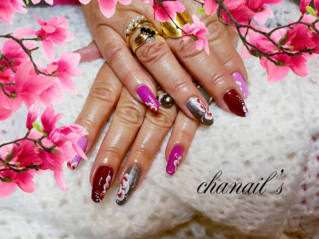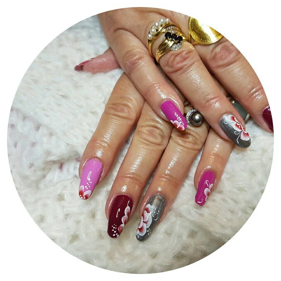 1 gainage sur ongle naturel trio de rose et gris et fleurs one stroke