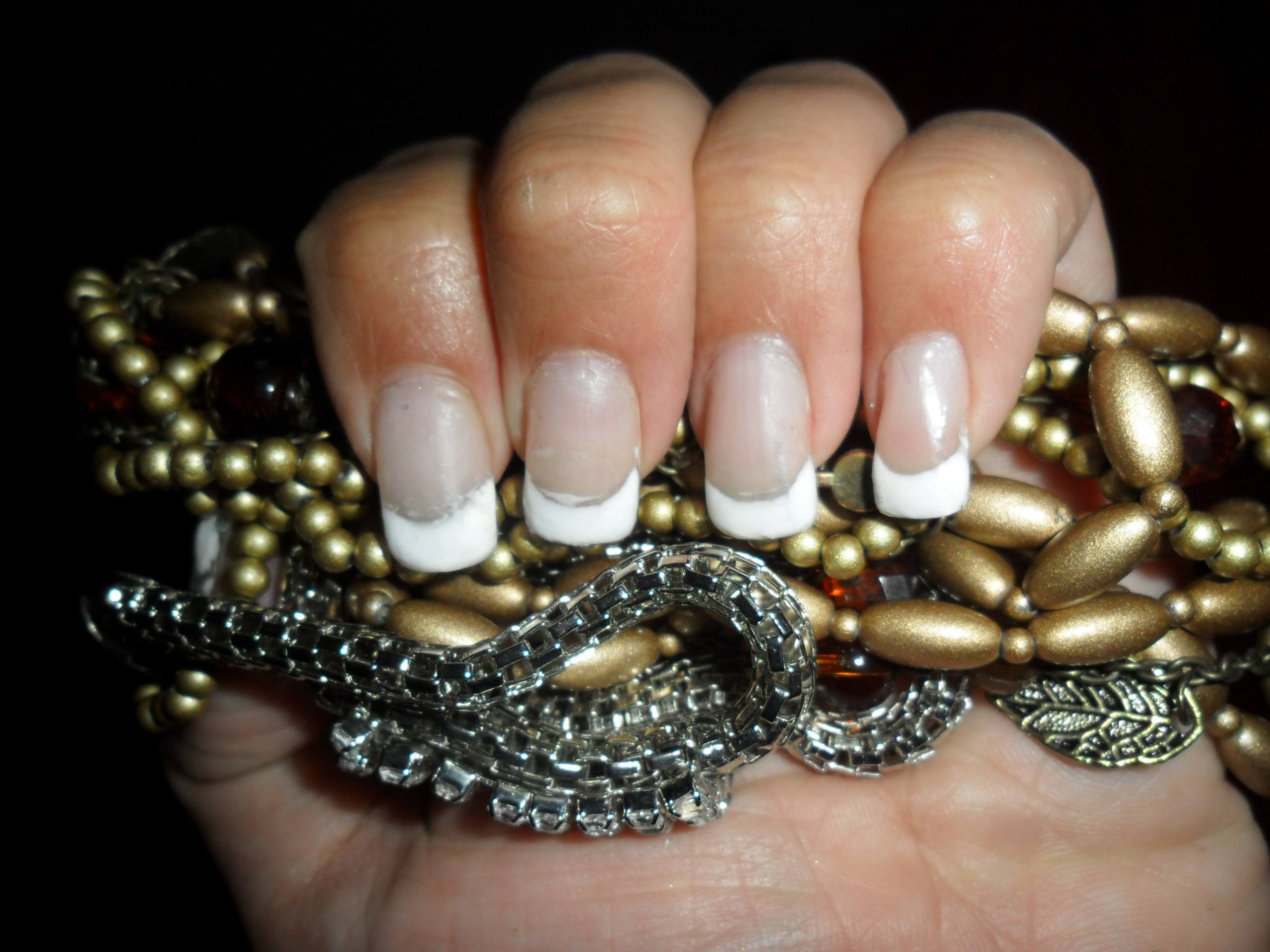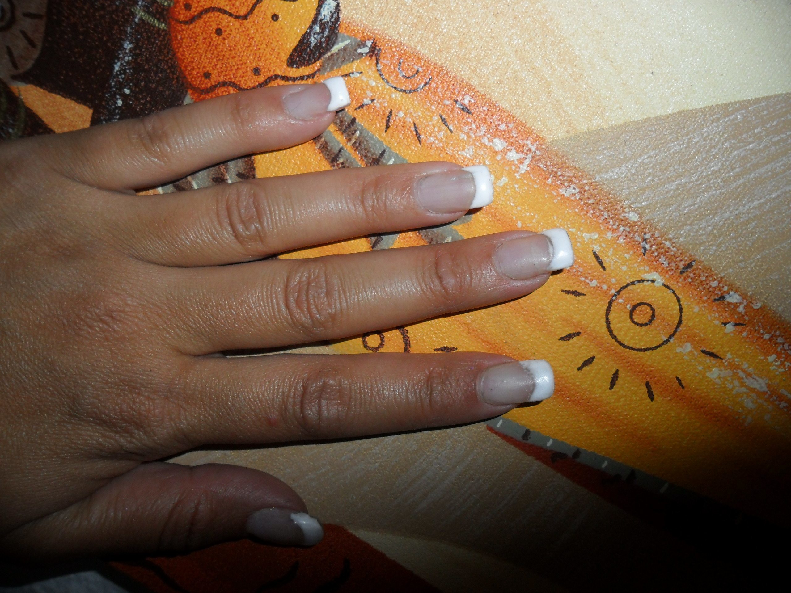 Tes french sont trop épaisses, pas toutes de la même taille et ton sourire n est pas net et n à pas la même forme sur tous les doigts.