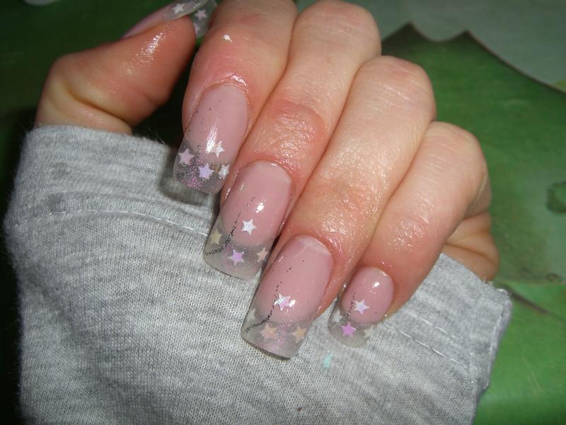 7 eme photo ; une pose que je me suis faite , pas envie de sortir la resine , donc pose avec unicum mask, caspules clear , gel irisé ibd sur le bord libre , et etoile inscrusté.