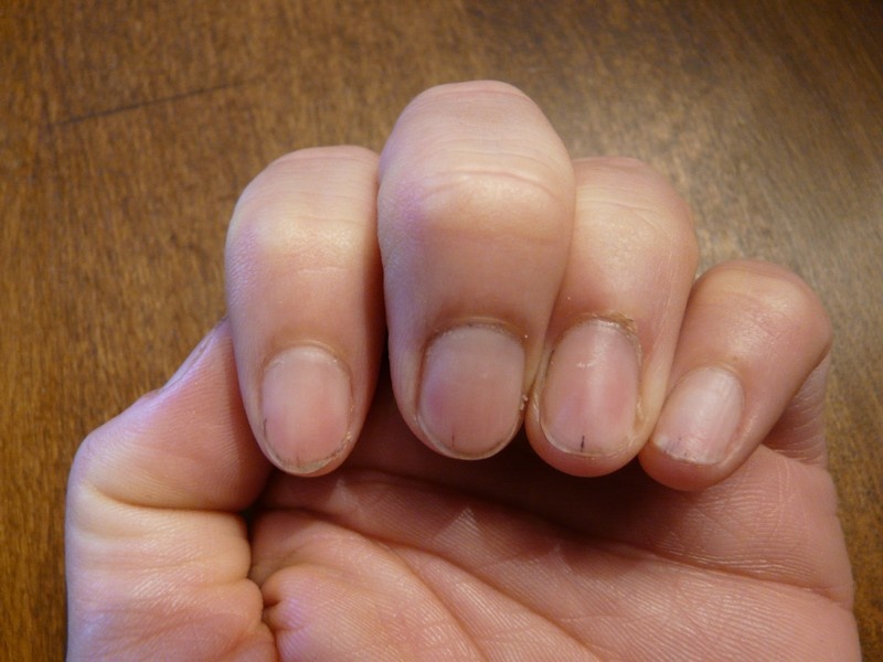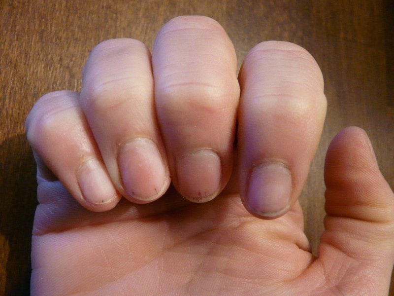 je pense avoir limé un peu trop bien sur, mais sans pour autant que se soit vraiment rouge, plutôt rosé! les petits traits que l'on voit au bas de certains ongles, a mon avis c'est par ce que j'ai coupé avec un ciseau à ongle la longueur des capsules et du gel, donc j'ai du faire des torsions que bien sur mes ongles n'ont pas apprécié.