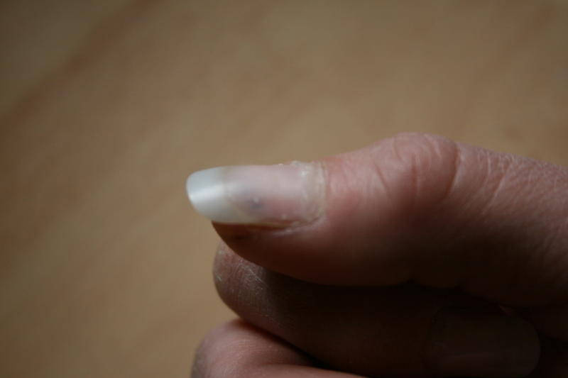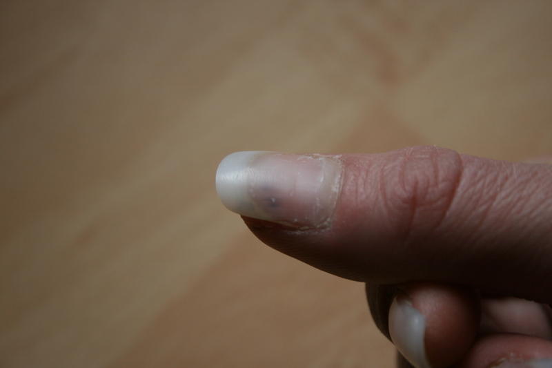 pour moi c'est juste un bleu ... j'ai déjà eu ce problème et j'ai continué à me faire des poses sans problème... jusqu'au moment ou le bleu est arrivé sur le bord libre de mon ongle et donc plus de bleu...