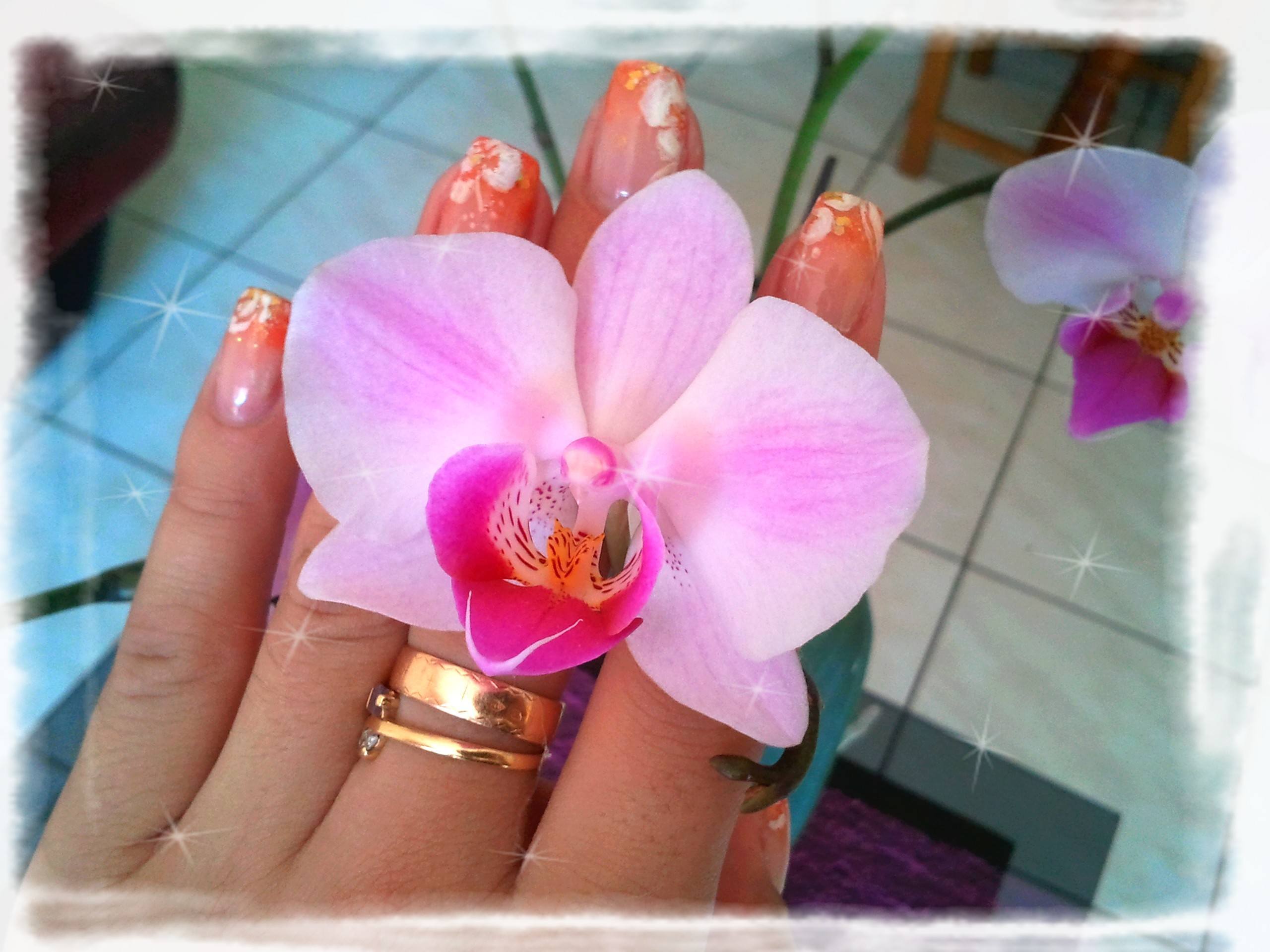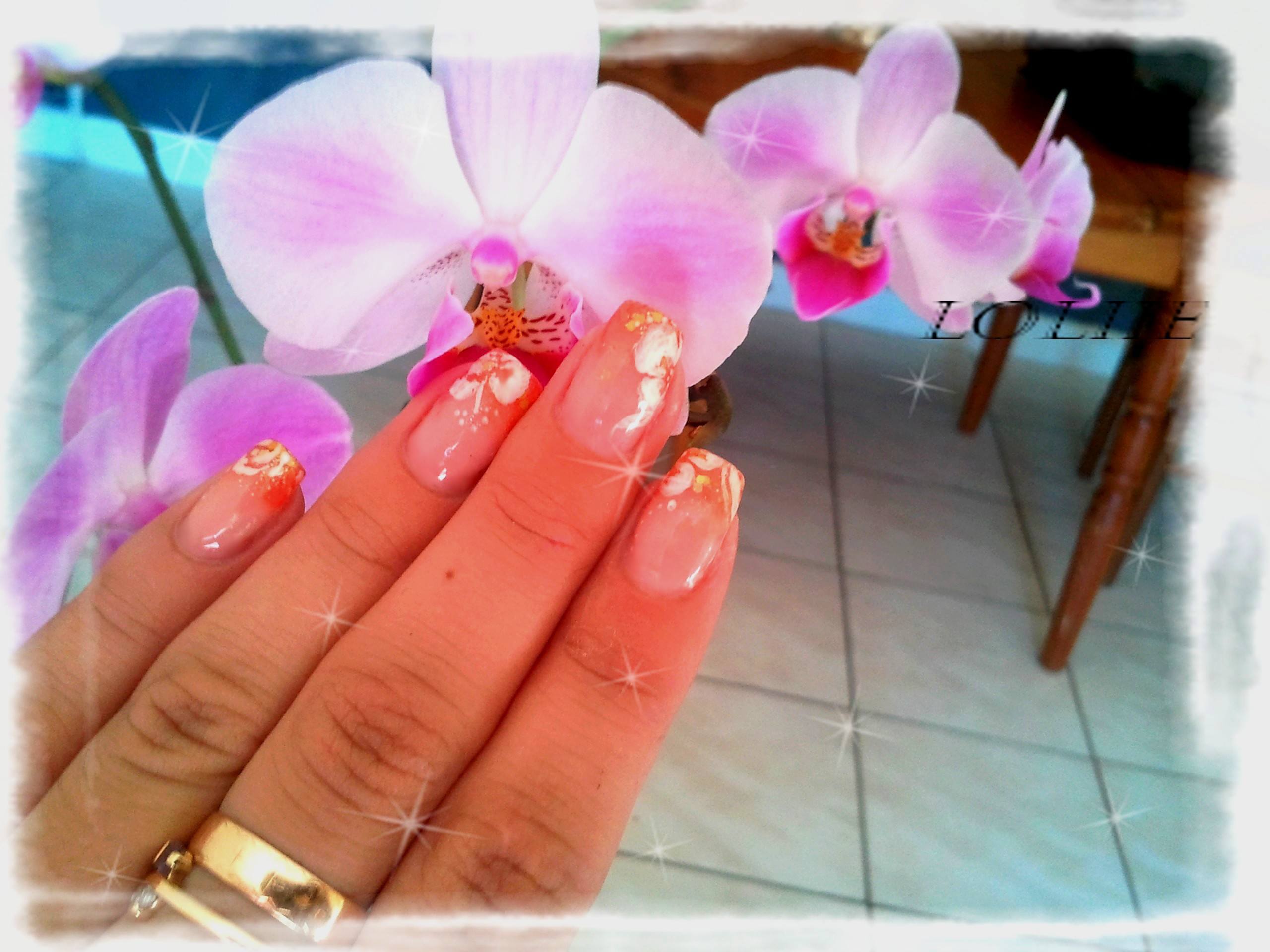 et ma derniere sur moi degradé orange et or pailleté et hibiscus ( desolee pour la couleur sur les photos mon appareil n est pas top j ai essaye de raviver un peu les couleurs pour vous donner un appercu mais ca ne rend pas la meme chose qu en vrai )