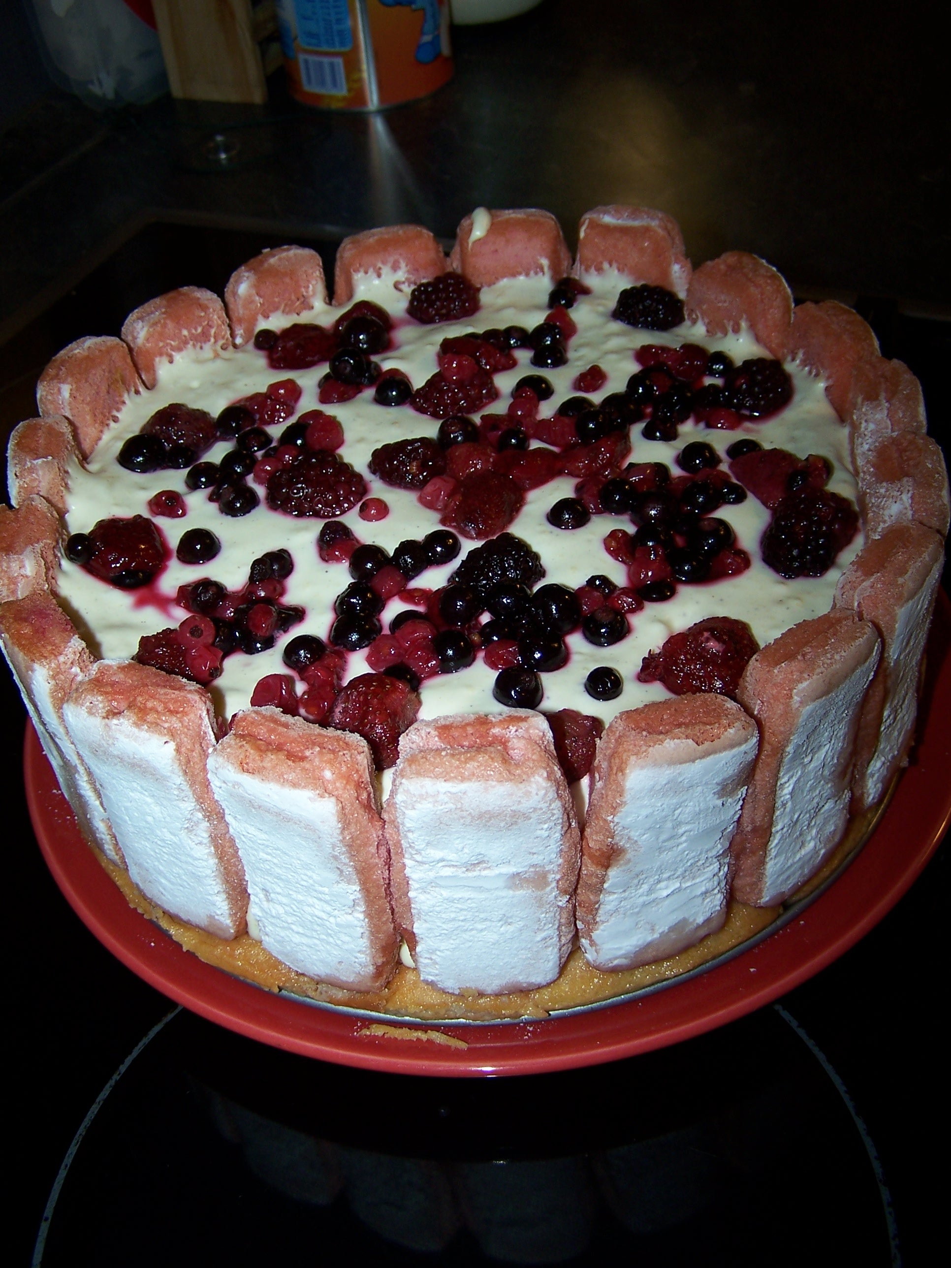 sinon ici je fais une charloote aux fruits rouge, j'ai eu l'inspi en regardant le meilleur patissier sur la 6 lundi. enfn je zappais au moment la et jme suis dit ouhaouuu comme c'est beau !! donc si c réussi je vous la prend en foto et vous la poste :)
