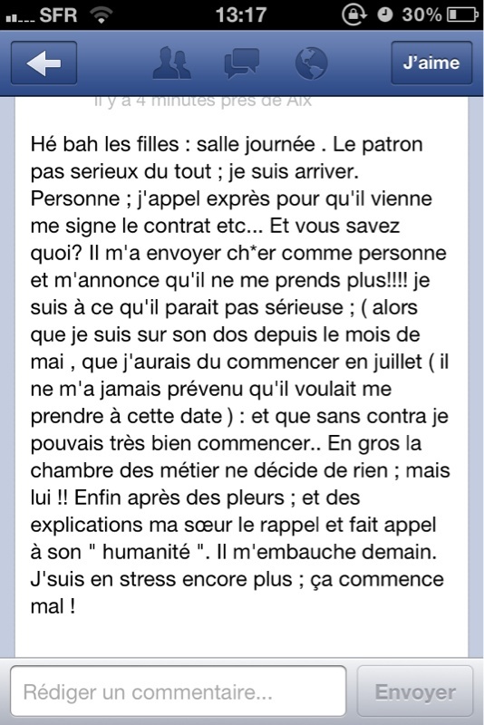 C'est ça ; il m'a prit pas piston alors il se croit tout permis. Mais surtout il s'est vexer que j'ai pas bosser pour lui cet été ; mais jamais il m'a dit de bosser ! Et après j'ai taffer dans des ménages dans une maison de fin de vie ; j'men serais passer !!! Il a cru que je m'amuser cet été " à la plage " c'est encore plus compliqué pour les jeunes; car si y a pas maman et papa derrière c'est même pas la peine .., moi m'a mère pour ça elle est pas douée mais heureusement que ma sœur à appeler pour lui remettre les idées en places !!!