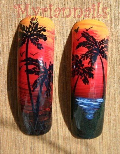 voilà comme j'arrive à rien sur mes doigts en ce moment, peut etre dû à la fatigue, je me suis fait quelques tips version "mer et cocotier" ....