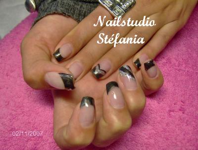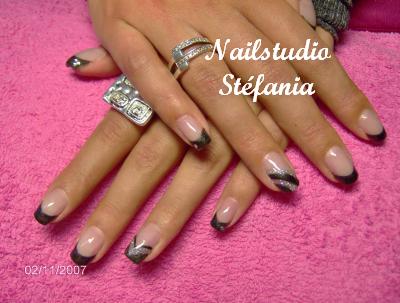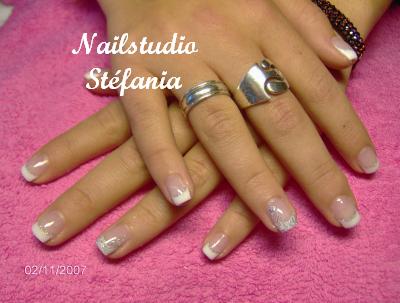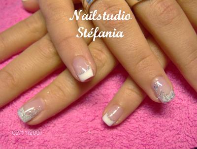 la 1ere: french sur une jeune fille (donc assez court) avec des paillettes argentées pour les sourires et du Crushed Argenté (Style comme du papier Alu) sur les annulaires.