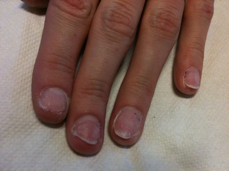 des ongles en plus sans bord libre....je demande pourquoi elle m'explique que la PO lui passait la ponçeuse en dessous avec un embout pointu qui d'ailleur parfois la blessait....J'ai compris pourquoi décollement de la plaque sur beaucoup d'ongle ...Un vrai carnage!!!!!!