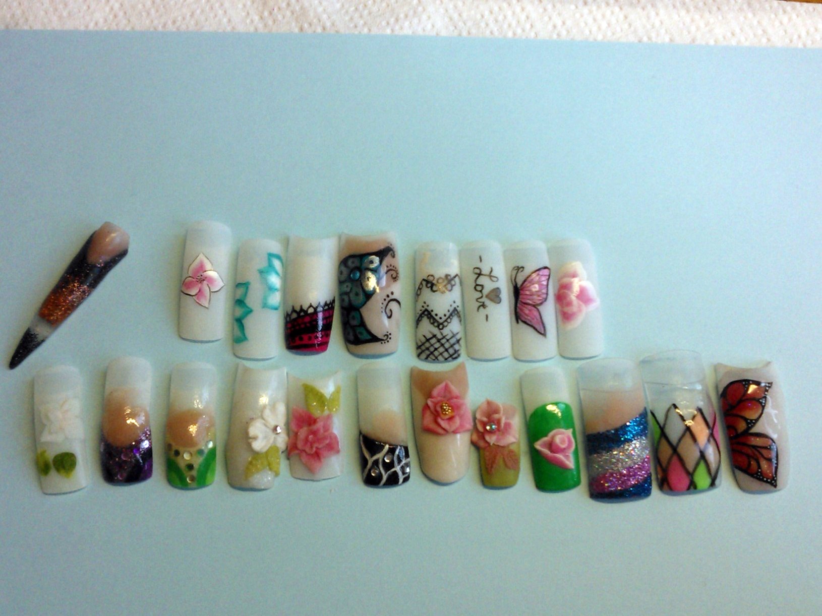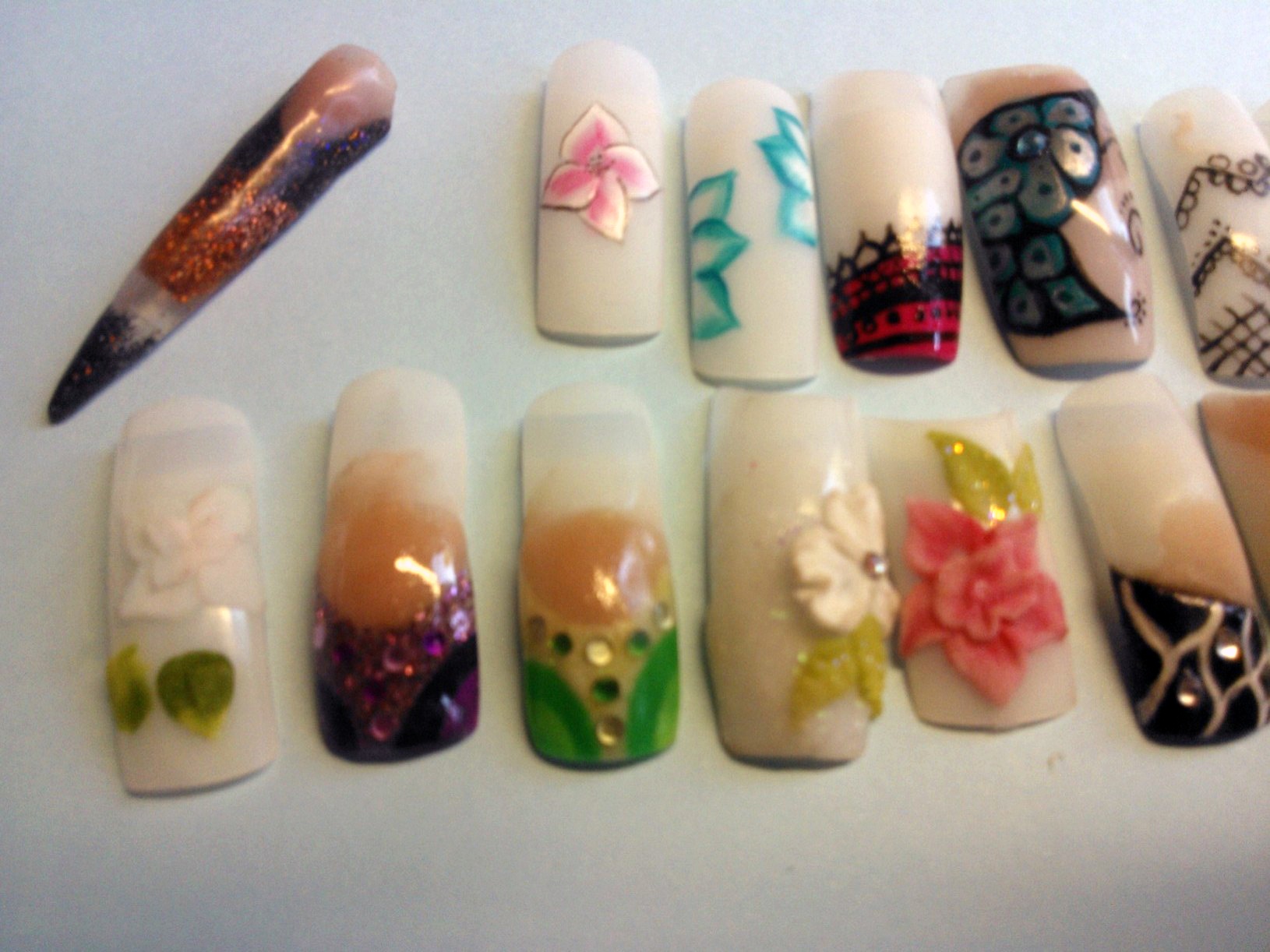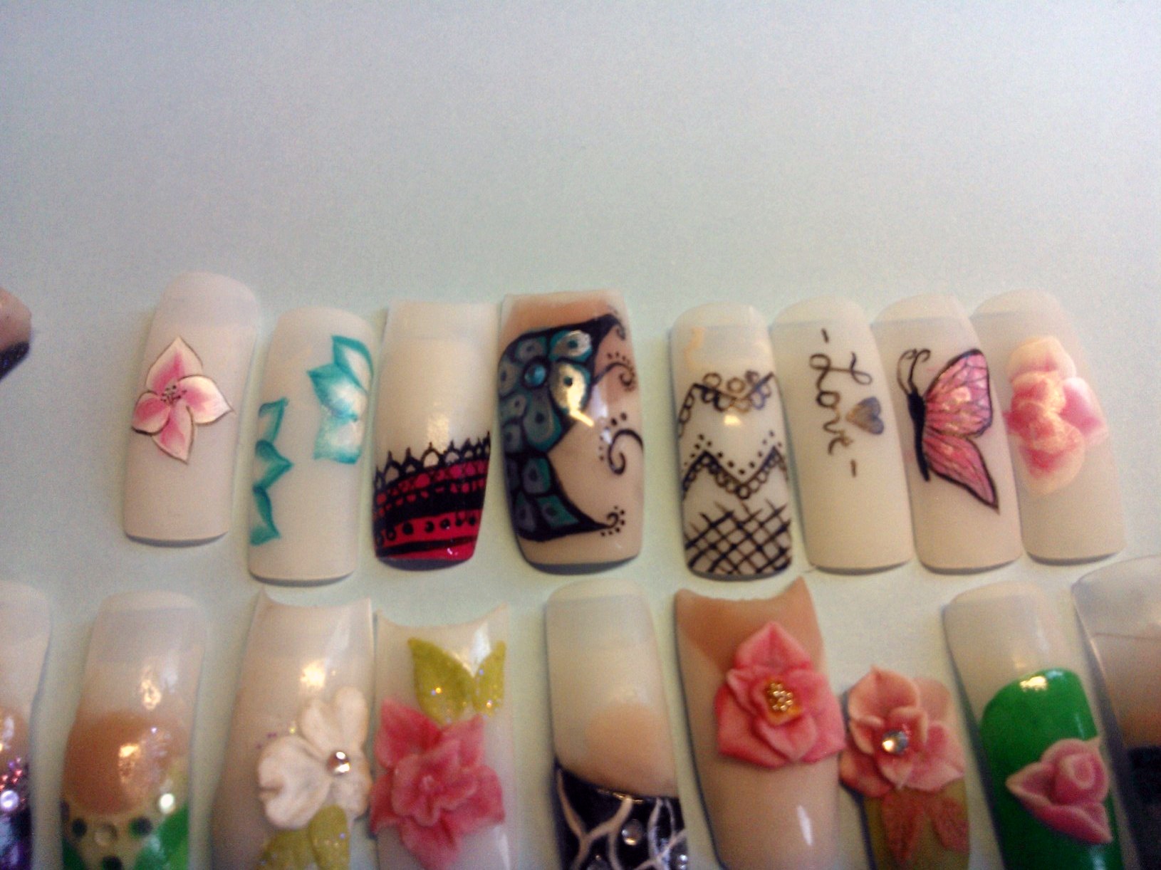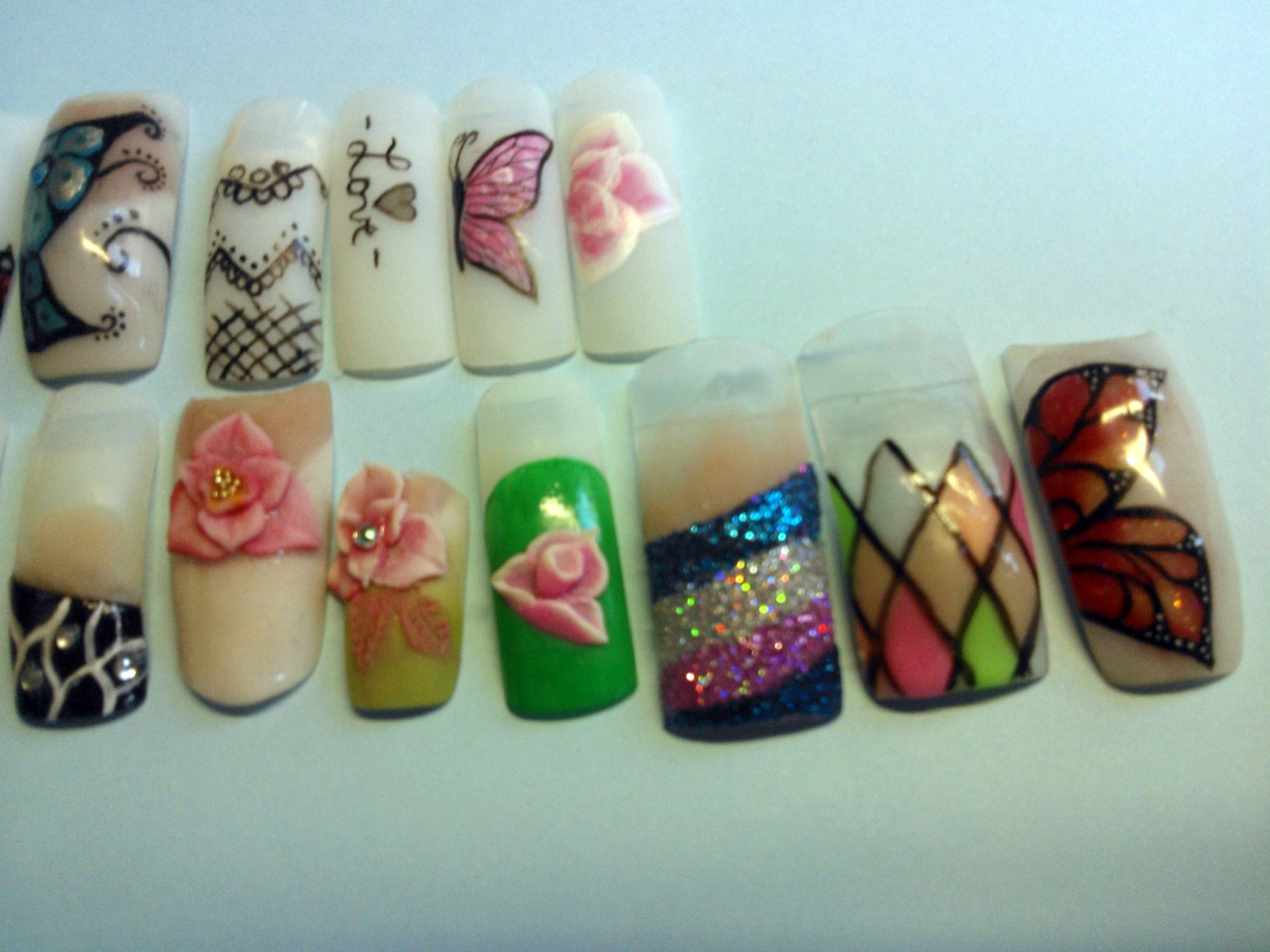 le premier c'est une copine à ma soeur (pose noire est blanche, chablons full gel, avec la photo de ses doigts avant, une rongeuse!!! mais malheureusement ils n'ont pas très bien tenu (1 semaine) je n'ai pas pu voir l'état, mais je suppose qu'elle a du les mettre en bouche, j'y ai passé 5 heures, surtout pour les french noires, que j'ai du recommencer ils n'avaient pas catalyser à coeur.. berk plein de collant noir sur ma pauvre lime!!!