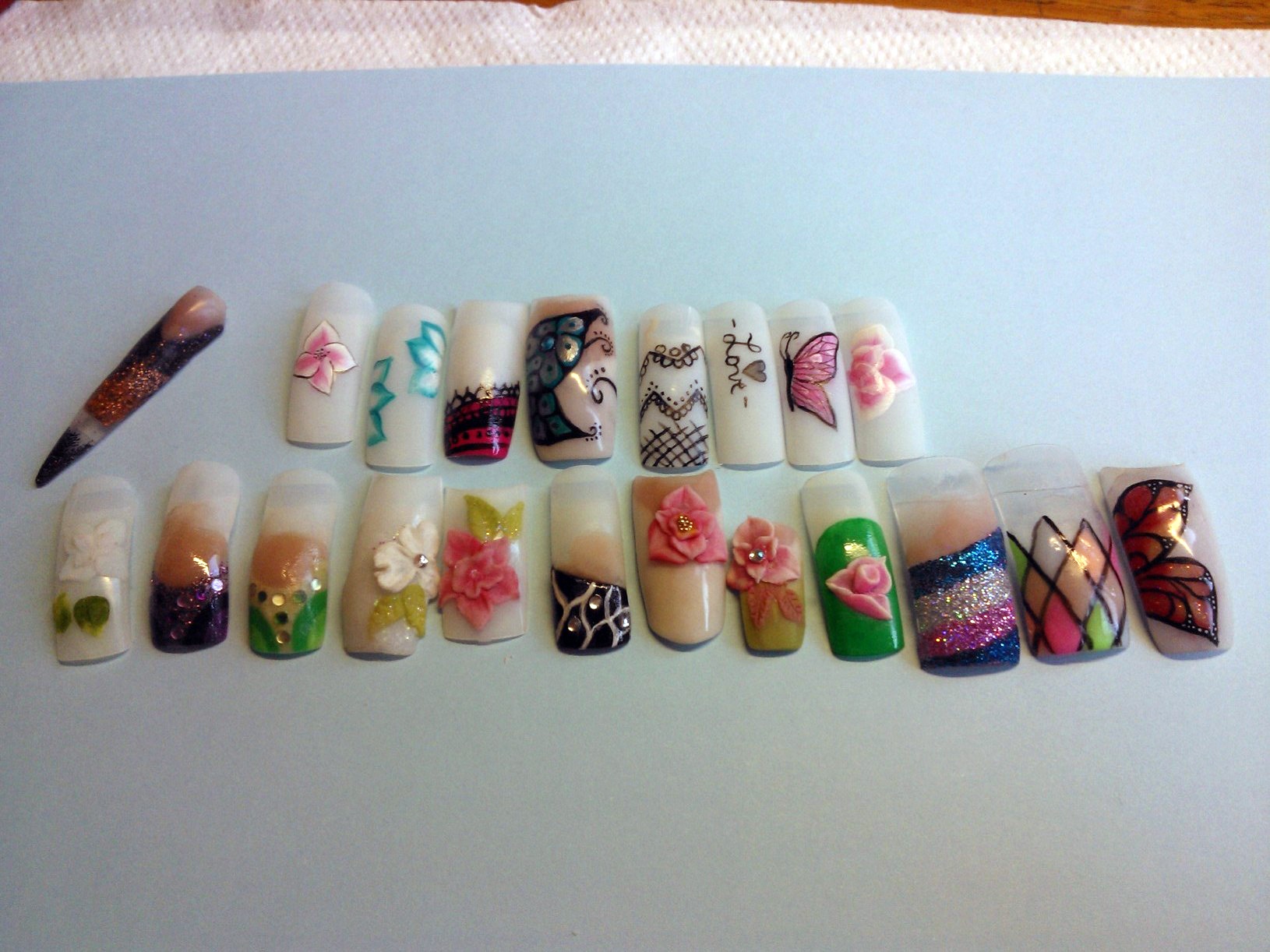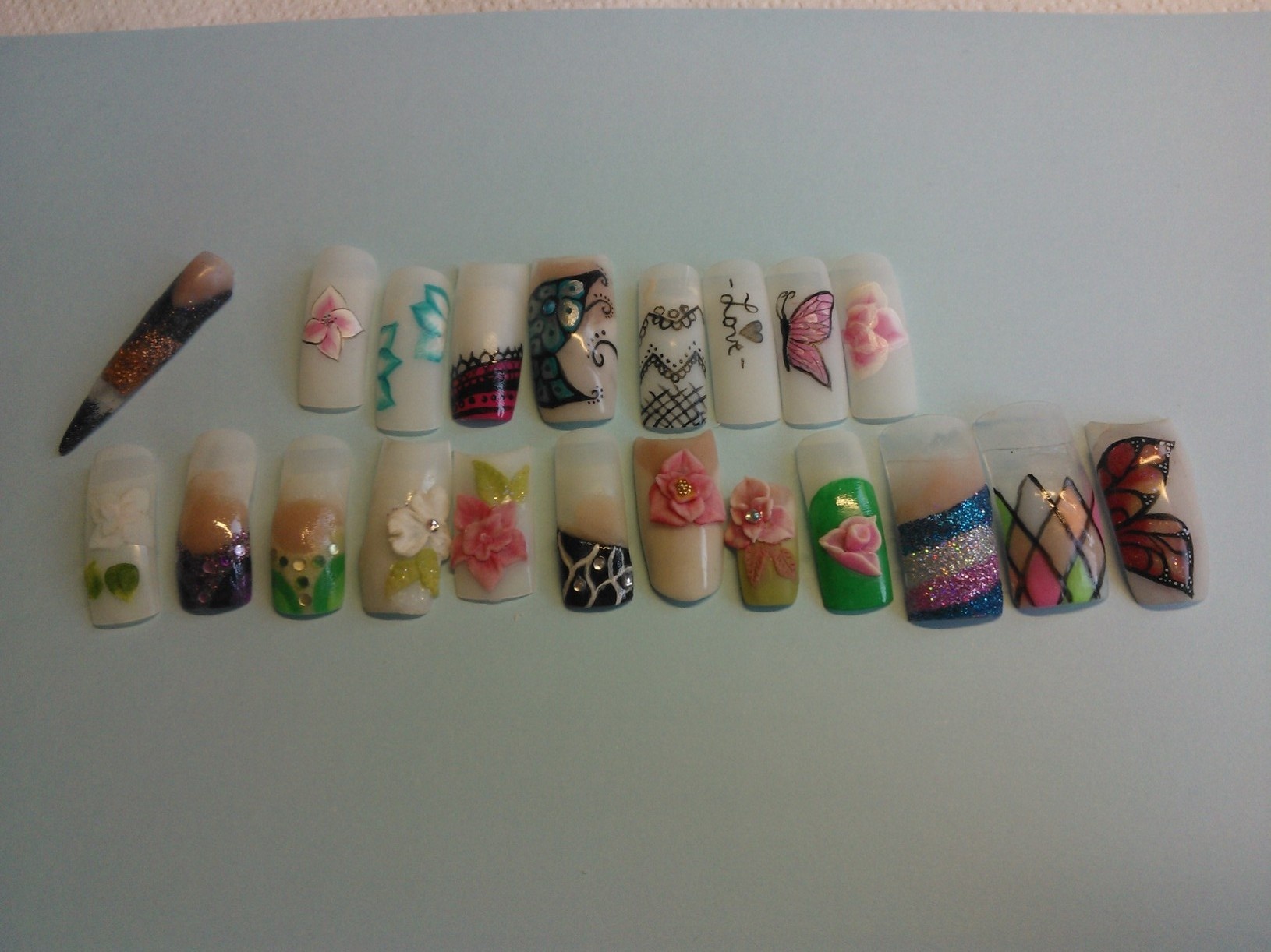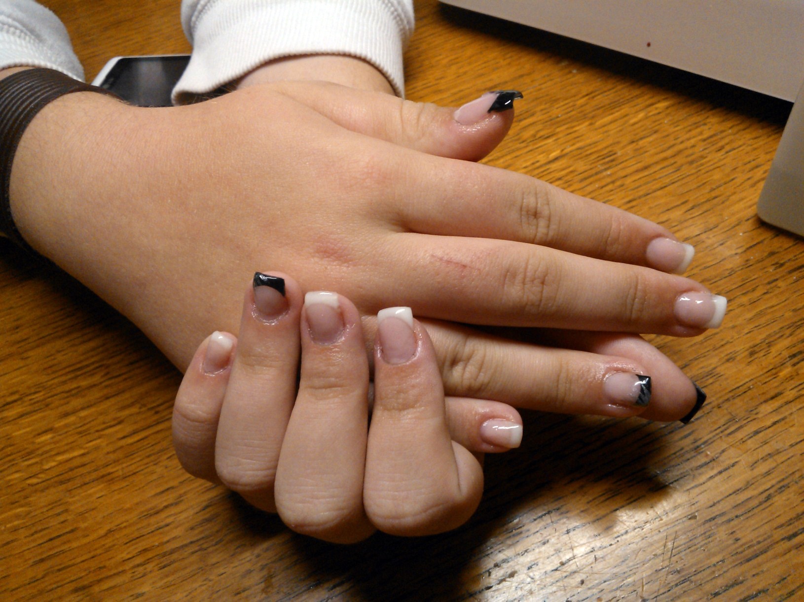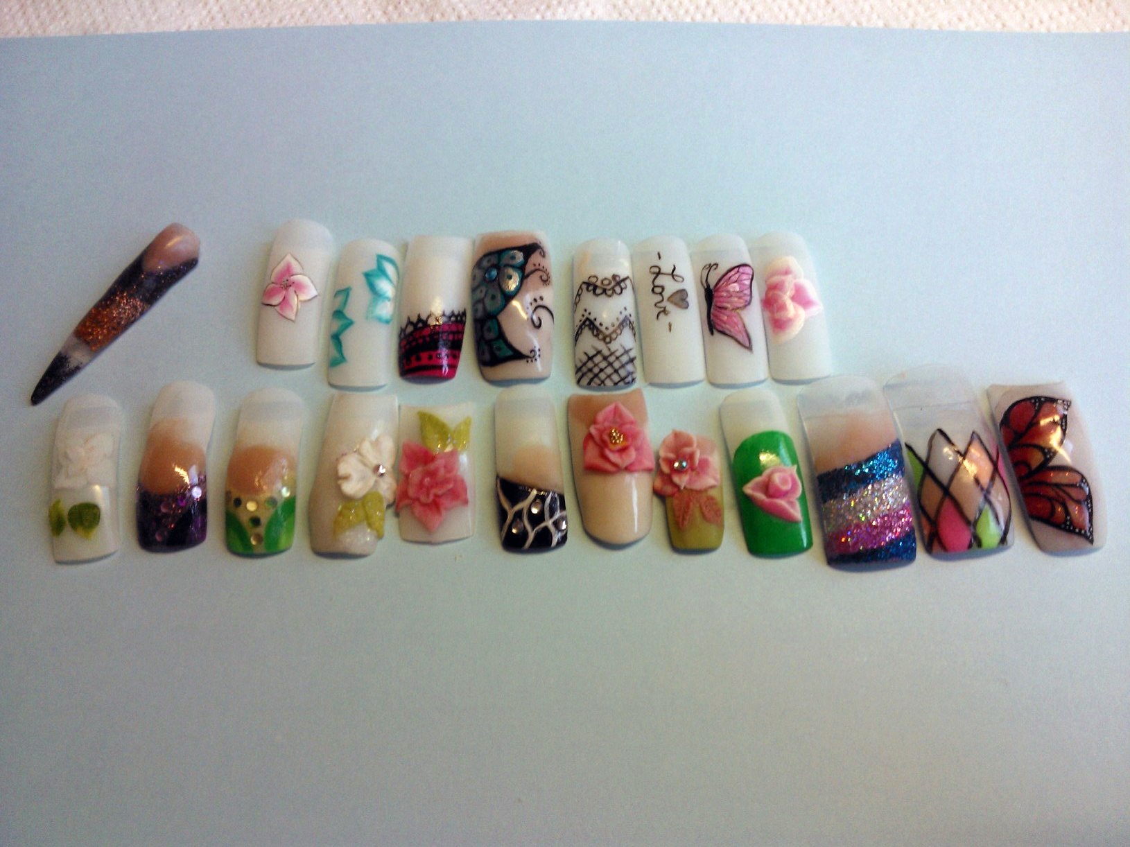 le premier c'est une copine à ma soeur (pose noire est blanche, chablons full gel, avec la photo de ses doigts avant, une rongeuse!!! mais malheureusement ils n'ont pas très bien tenu (1 semaine) je n'ai pas pu voir l'état, mais je suppose qu'elle a du les mettre en bouche, j'y ai passé 5 heures, surtout pour les french noires, que j'ai du recommencer ils n'avaient pas catalyser à coeur.. berk plein de collant noir sur ma pauvre lime!!!