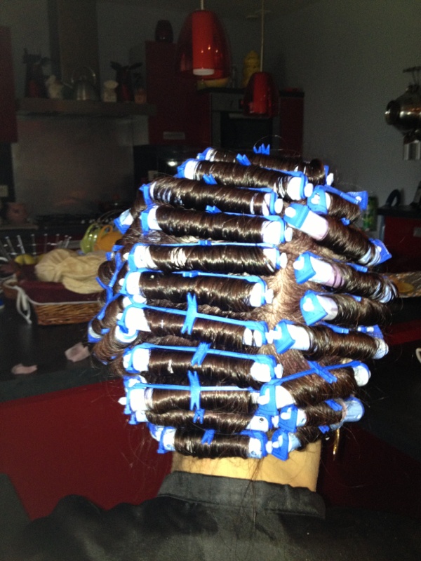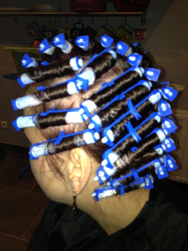 Lola ,pas mal ta perm mais attention au vides entre les bigoudis,tes mèches sont tres larges je pense...je te conseille d'acheter les transparents avec des boules sur le coté ,moins de 6 euros pour 50 elastiques.bon courage à tout le monde