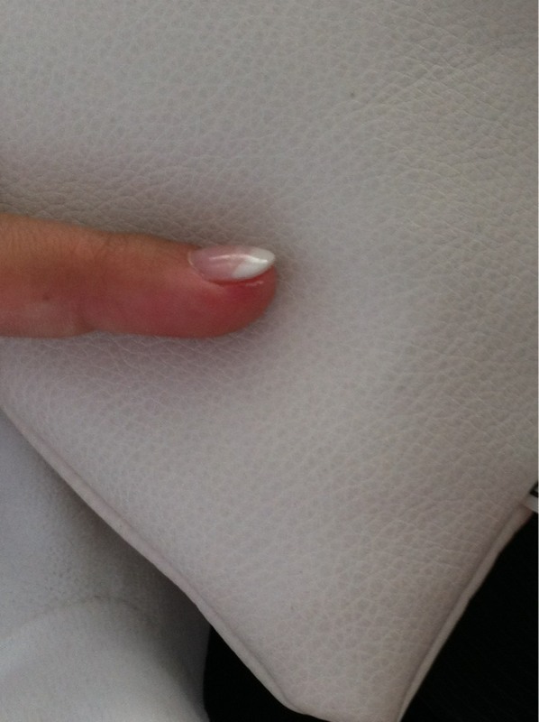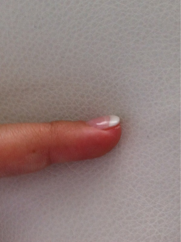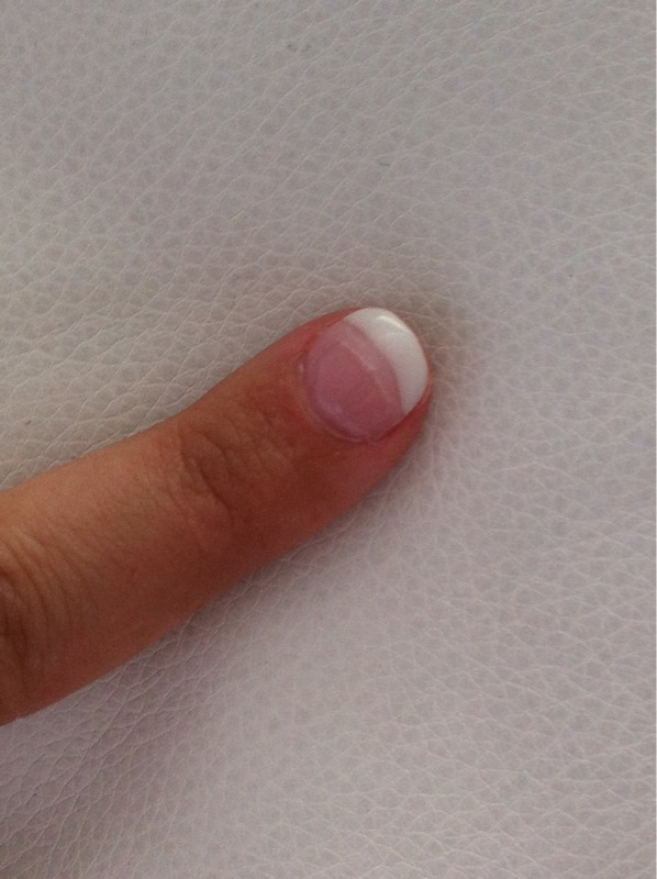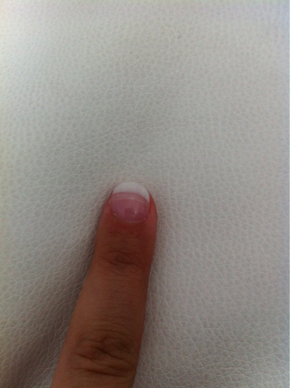 Tu ne trouve rien qui cloche??? On vois beaucoups le tips!! Il faut limer le tips et le fondre avec ton ongle. sinon c'est pas mal il ya meme un bombé donc continue tes entrainements. 