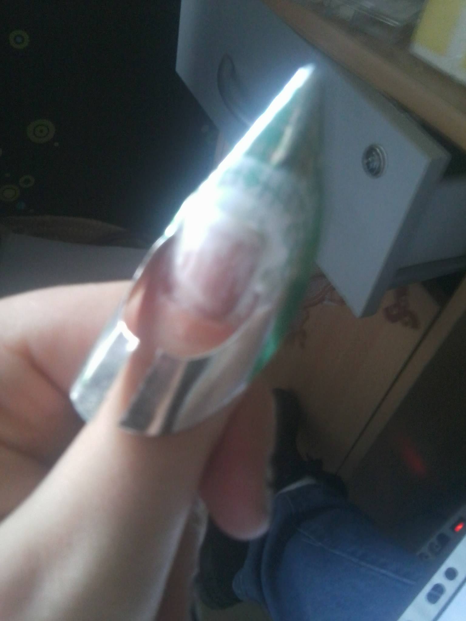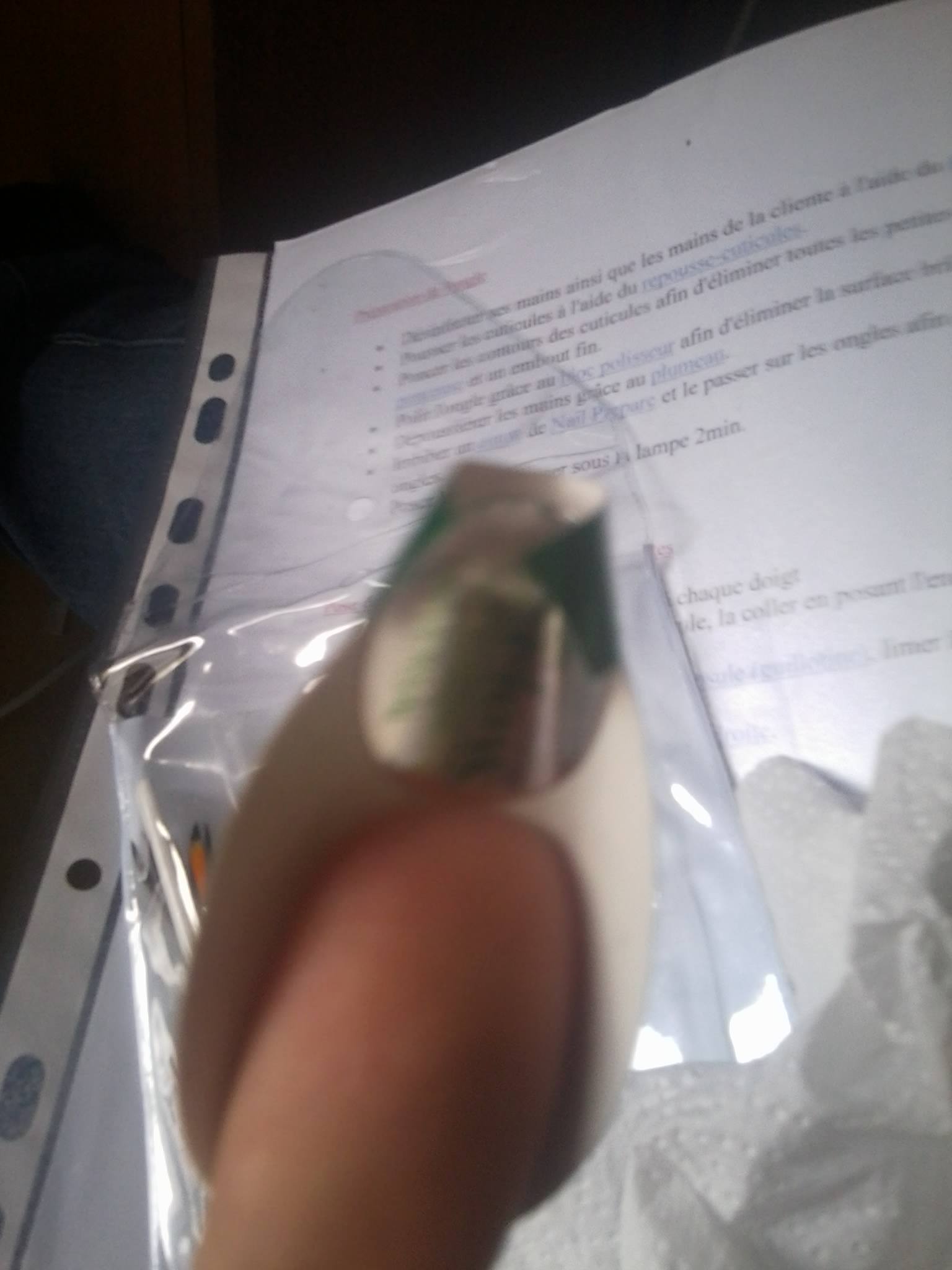 J'ai commandé lundi un lot de chabons ... et aujourd'hui ils sont arrivés!!! je n'ai pas pu m'empêcher de test sur un doigt ... (un seul d'abord pour avoir votre avis et me faire une pose complète dans deux semaines pour un mariage ... ) Alors je commence (prep ongle) et je pose le chablon autocollant, et premier problème, le chablon n'arrive pas a coller (voir photo) j'essaie donc quand même la pose de gel french ... Et le cauchemar commence ! le papier du chablon ne coller pas a mon ongle, je sais pas comment dire : Au niveau de l'ongle où il faut appliquer le gel french, le chablon ne coller pas sur le derriere de l'ongle ... Que faire ? Pour ne pas gaspiller je continue malgré ce soucis ... Mais tout coule ! C'est du gel de chez ongle discount, qui est assez liquide et pas évident a travailler (voir photo) je recommence tout de ce fait ... Et puis le deuxième essai est plus concluant : j'ai appliquer du blanc et ça encore couler, j'ai mis mon pouce deux min sous la lampe, et après le gel a était plus simple a travailler mais quand j'ai enlever le chablon, le gel franch était très fin, vous pensez que j'en ai pas mis assez ? j'ai mis le gel de construction et finition et limer ... Voilà le résultat, j'attend vos critiques ;)