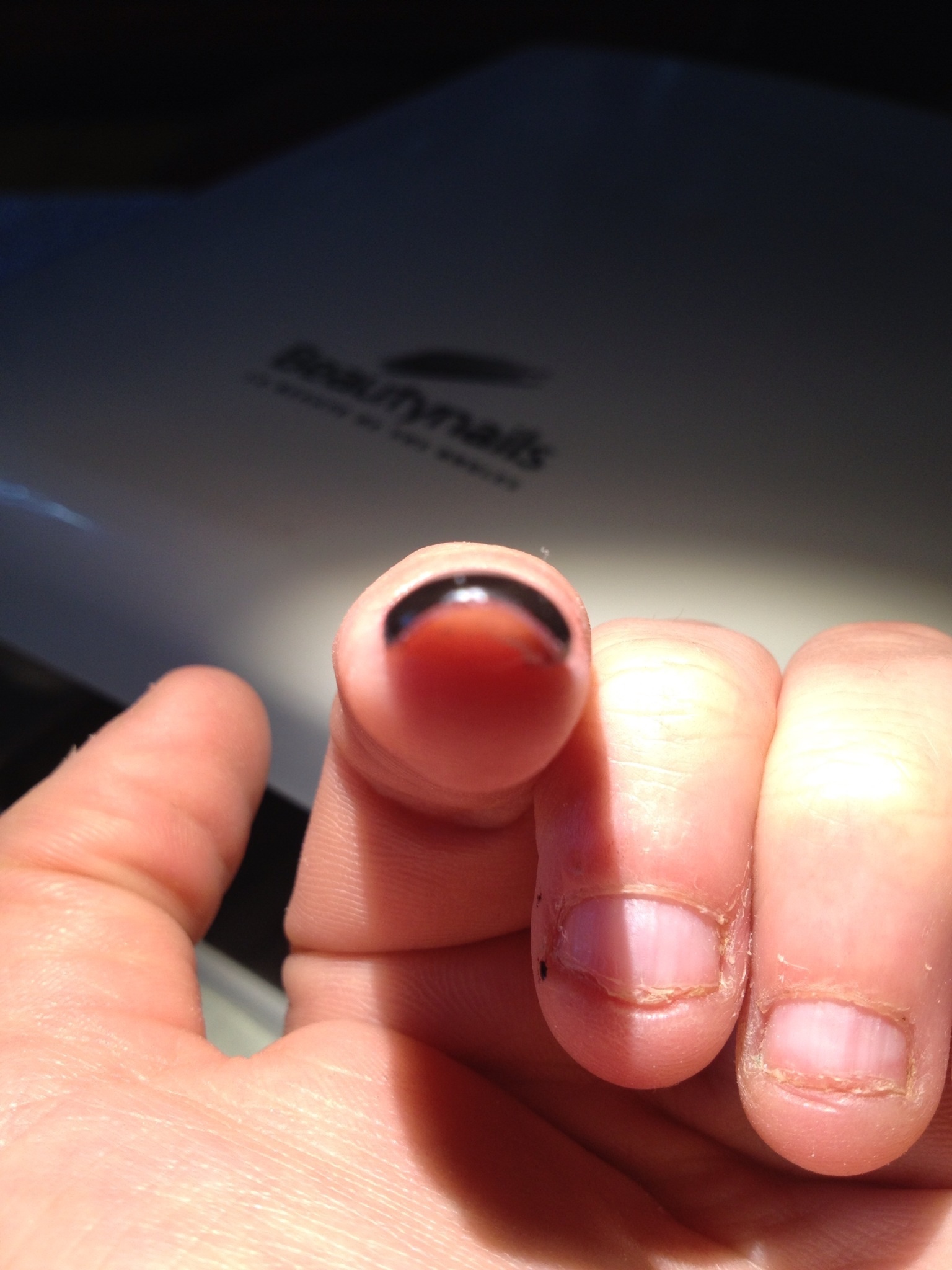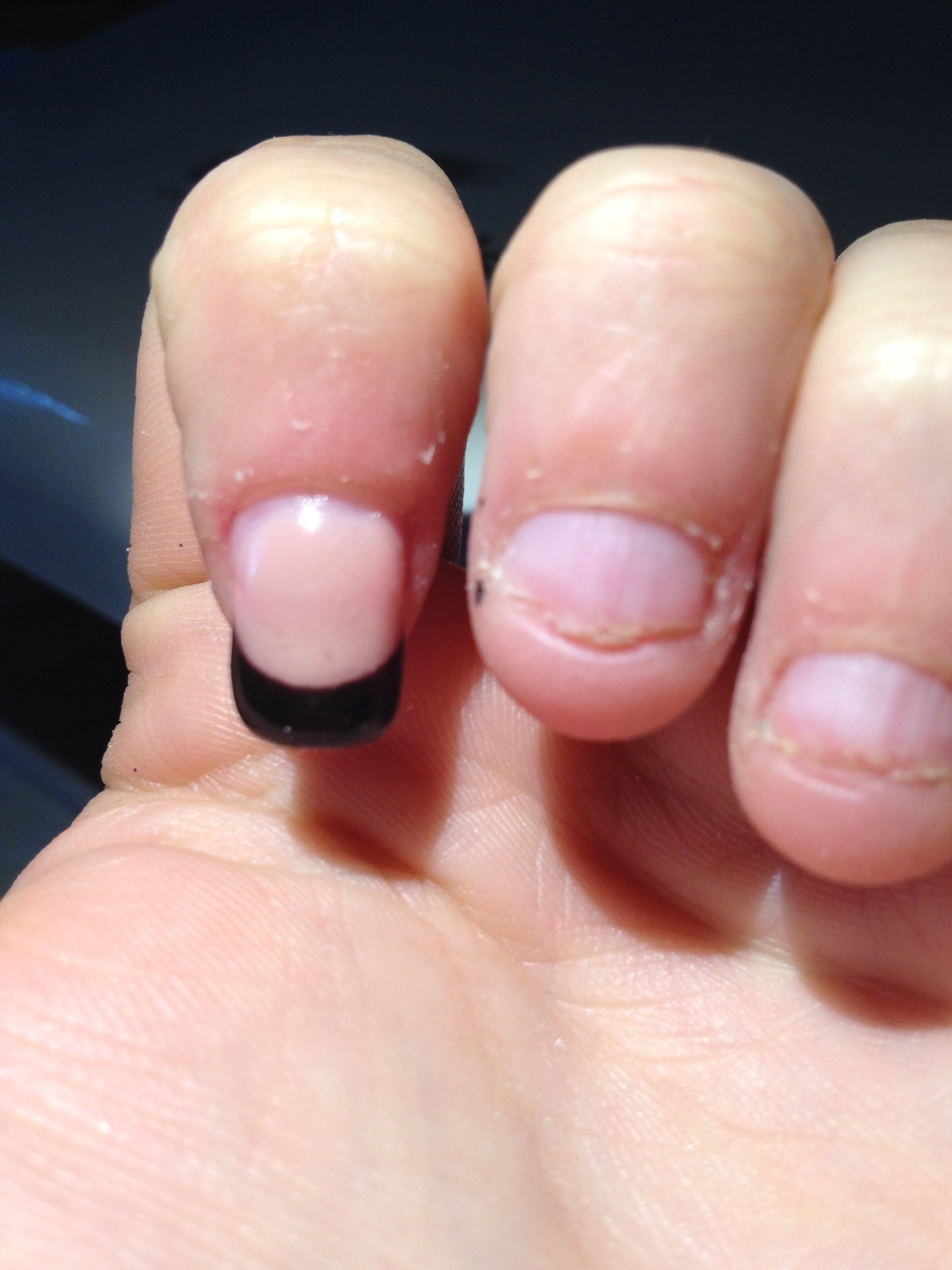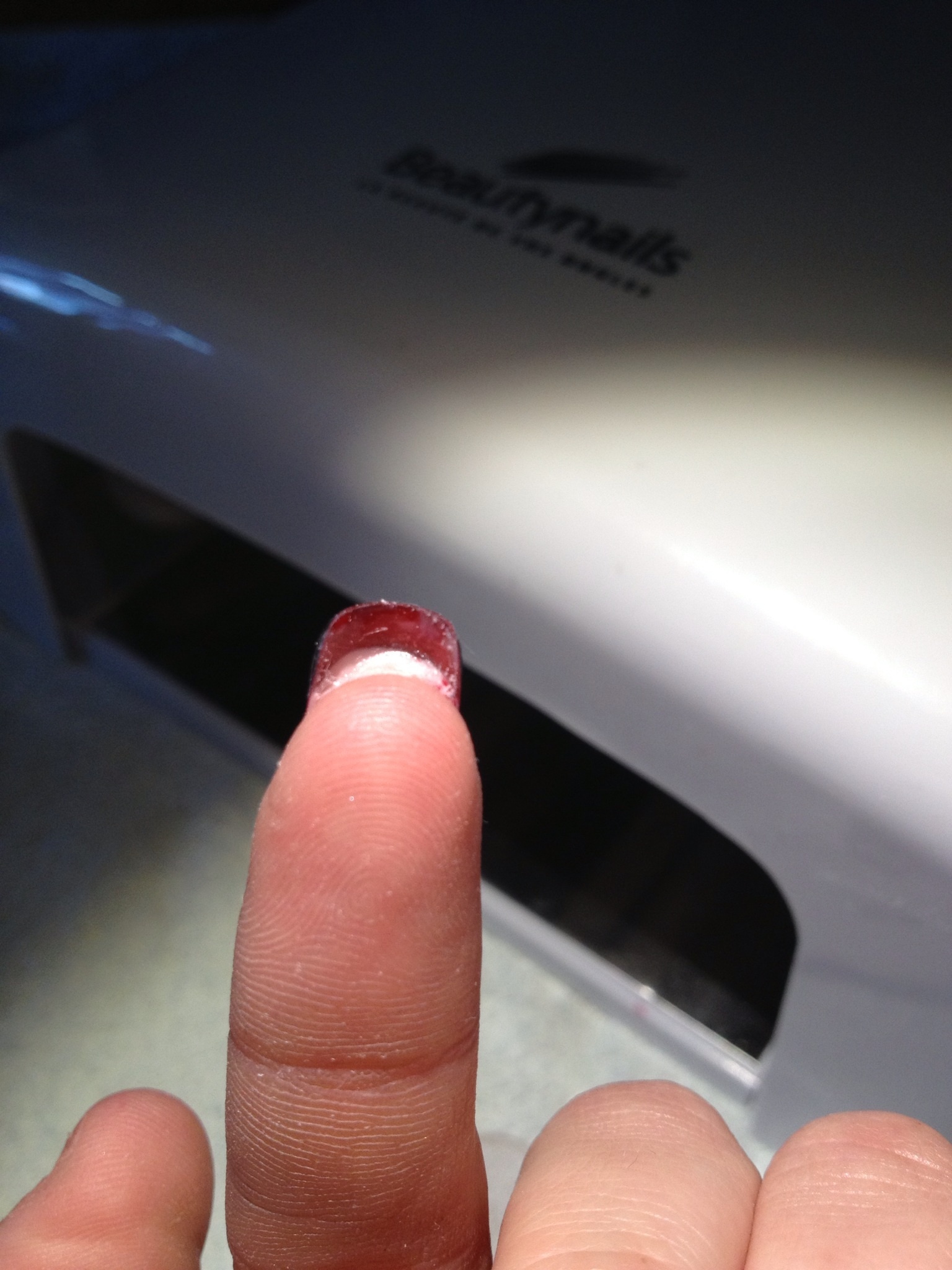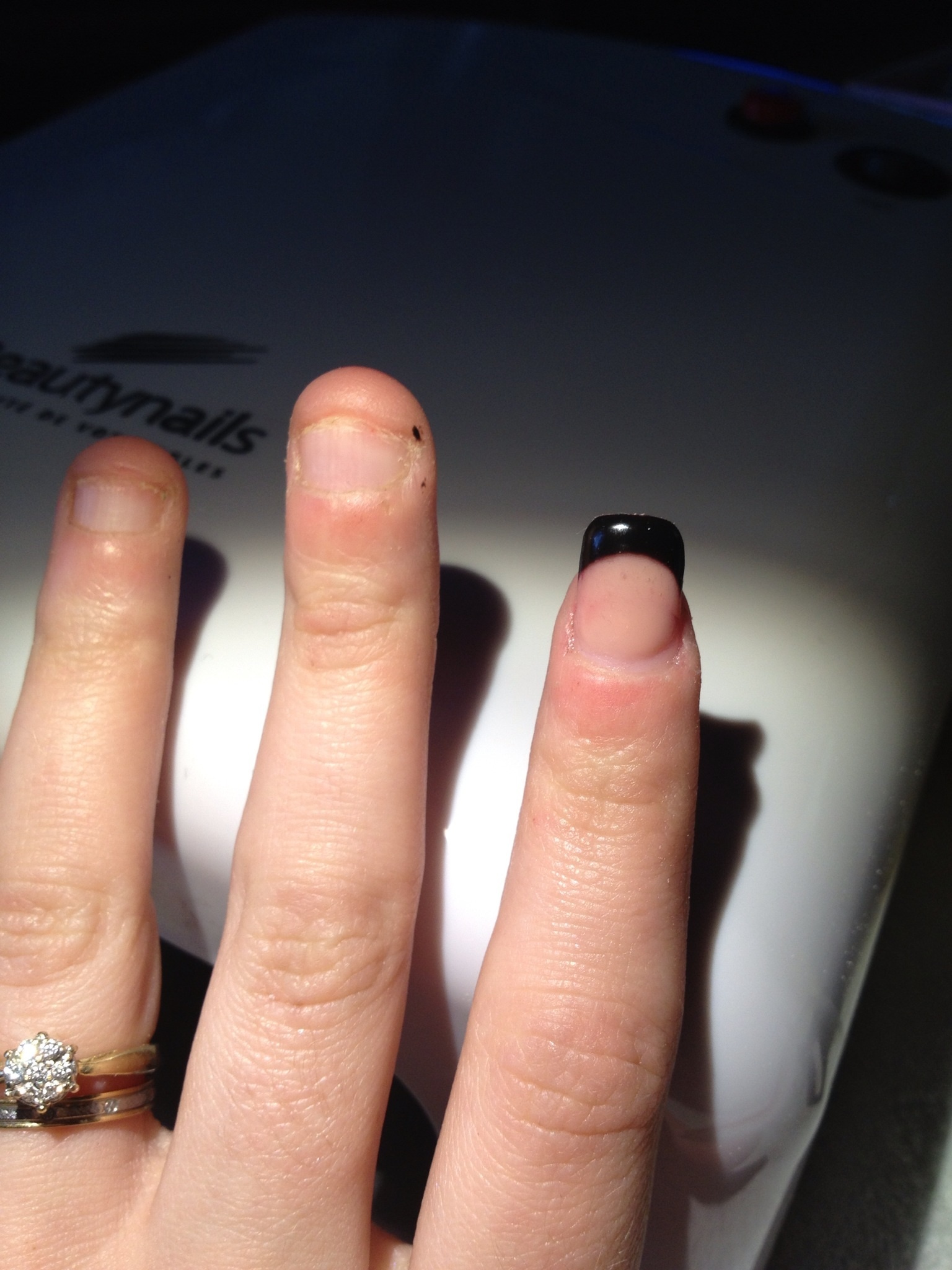 Cet essai est sur moi, j'ai oublié de prendre une photo avant la pose mais vous pouvez le voir grâce aux autres doigts...(je suis un vilain petit castor!!!). Pour la longueur j'ai délibérément fait aussi long vu que c'est juste un essai sur l'index et que je vais l'enlever après.