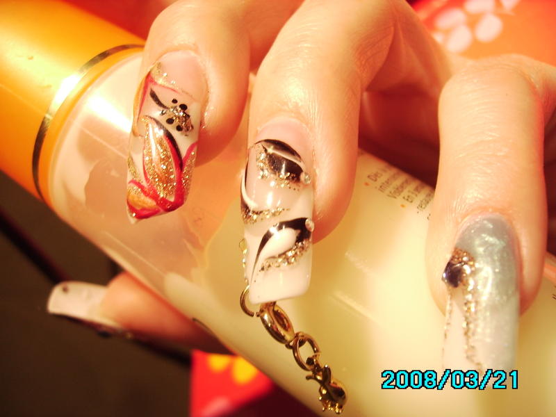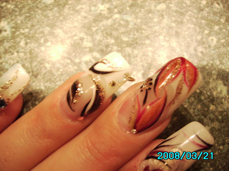 Merci miss ... en fait on voit mal la couleur mais c'est " rose baby", noir et gel pailleté or, les couleurs rendent trop bien ensemble.. y a plus qu 'a affiner les motifs !!:wink: