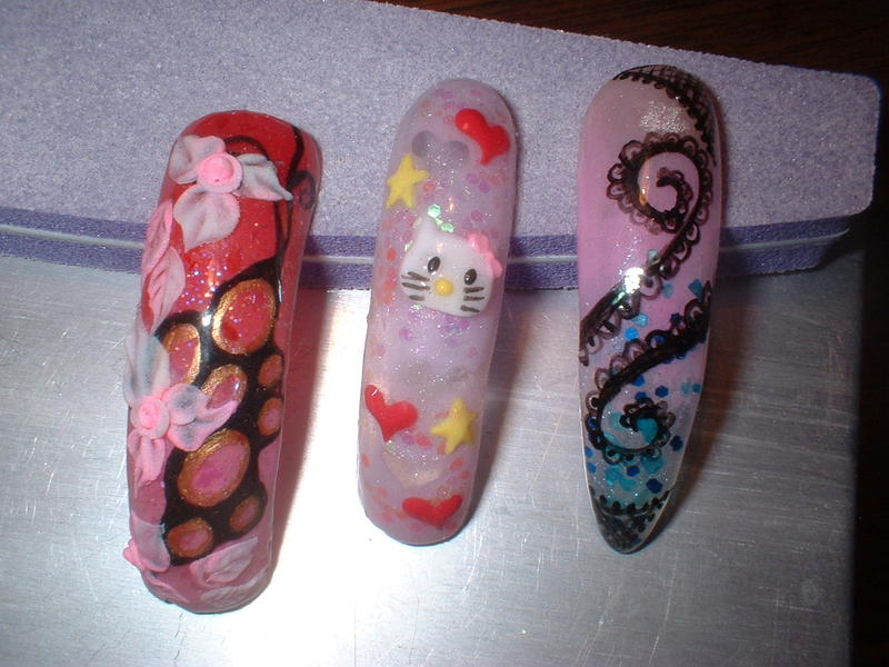 Encore quelques essais sur tips, il y a un peu de tout, 3D, inlay, peinture et un petit délire Hello kitty!lol!