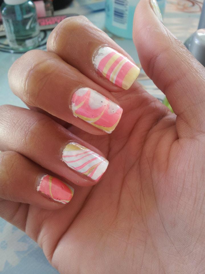 Bon, apres avoir lu les actuces et regardé les tutos j'ai envie de recommencer ;) seul probleme que j'ai trouve inexplicable, c'est que la couleur plus claire de vernis n'etait pas aussi claire sur l'ongle a cause de plusieur cercles les couleurs qui se mettent l'une sur l'autre et apres l'application sur le surface d'ongle la couleur perds son valeur. C'est vraiment dite marbre. Mais je voudrais aussi avoir un dessin avec le traits nettes.