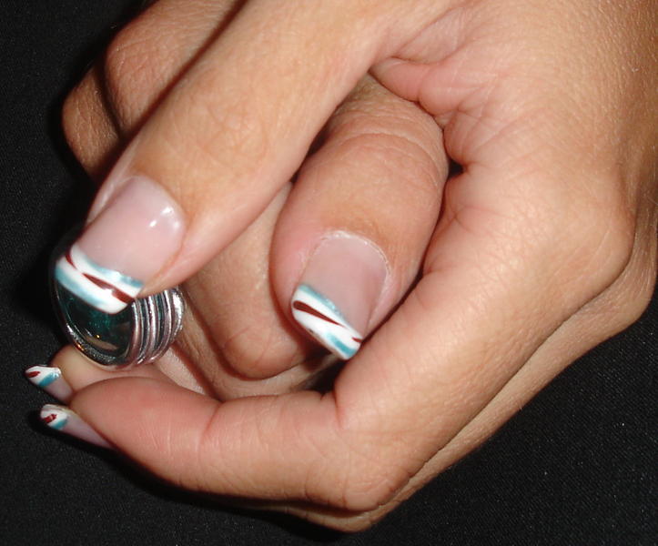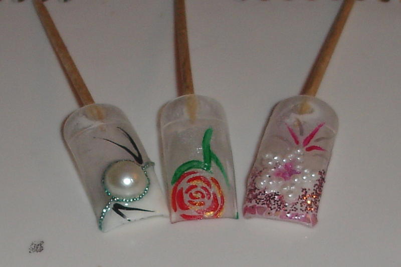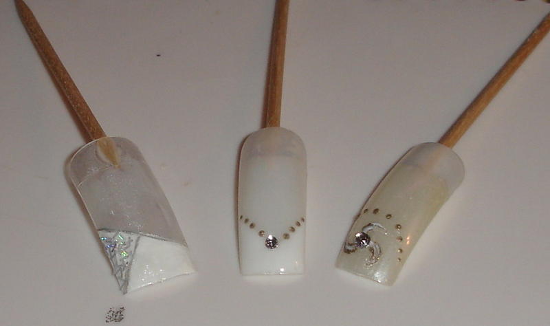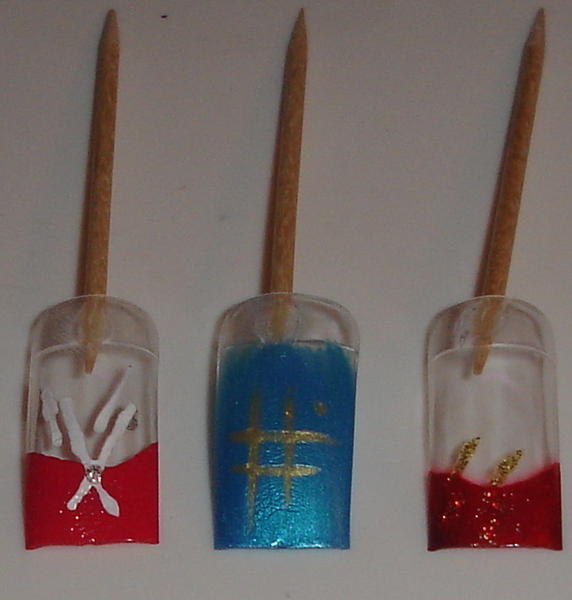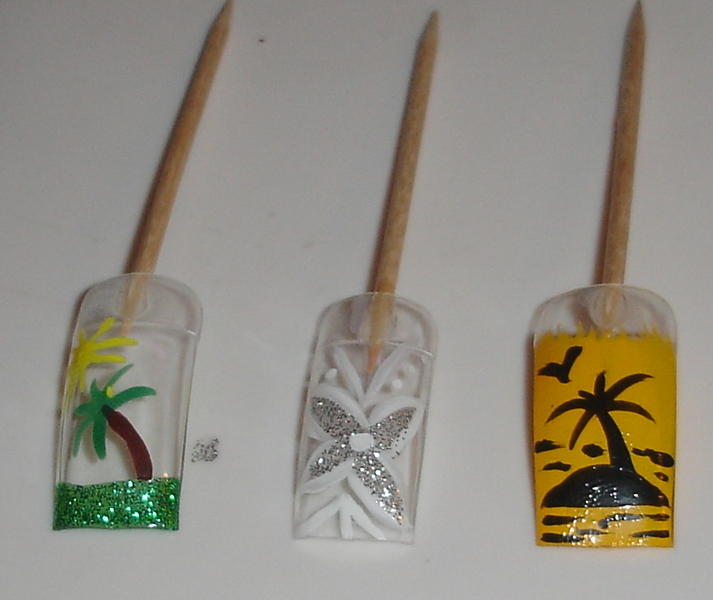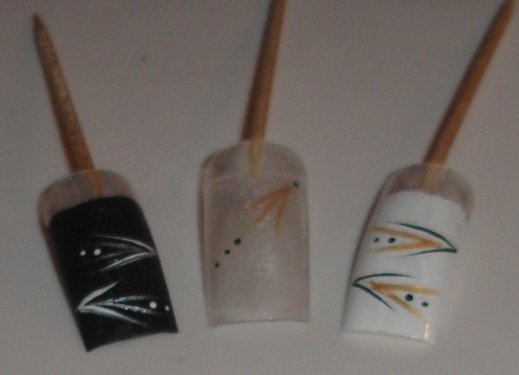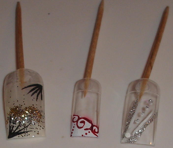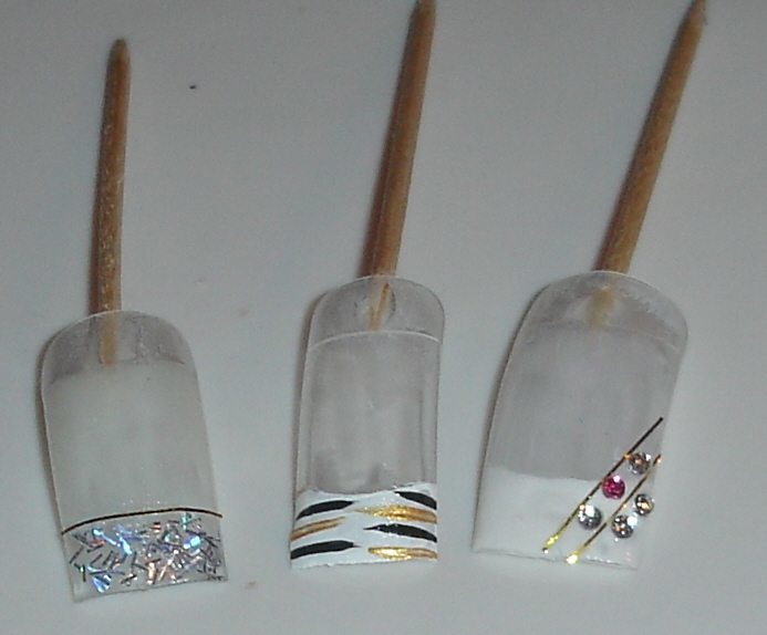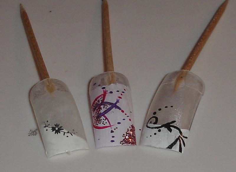 alors pour coller les cures dents j'utilise la colle tips j'y mets un point sur l'ongles posé sur la table (à l'envers) et j'appuie le cure dent dessus pendant 10 sec environ et ensuite tout tient nickel ... fo laisser sécher avant de poser sur un support en mousse !!!