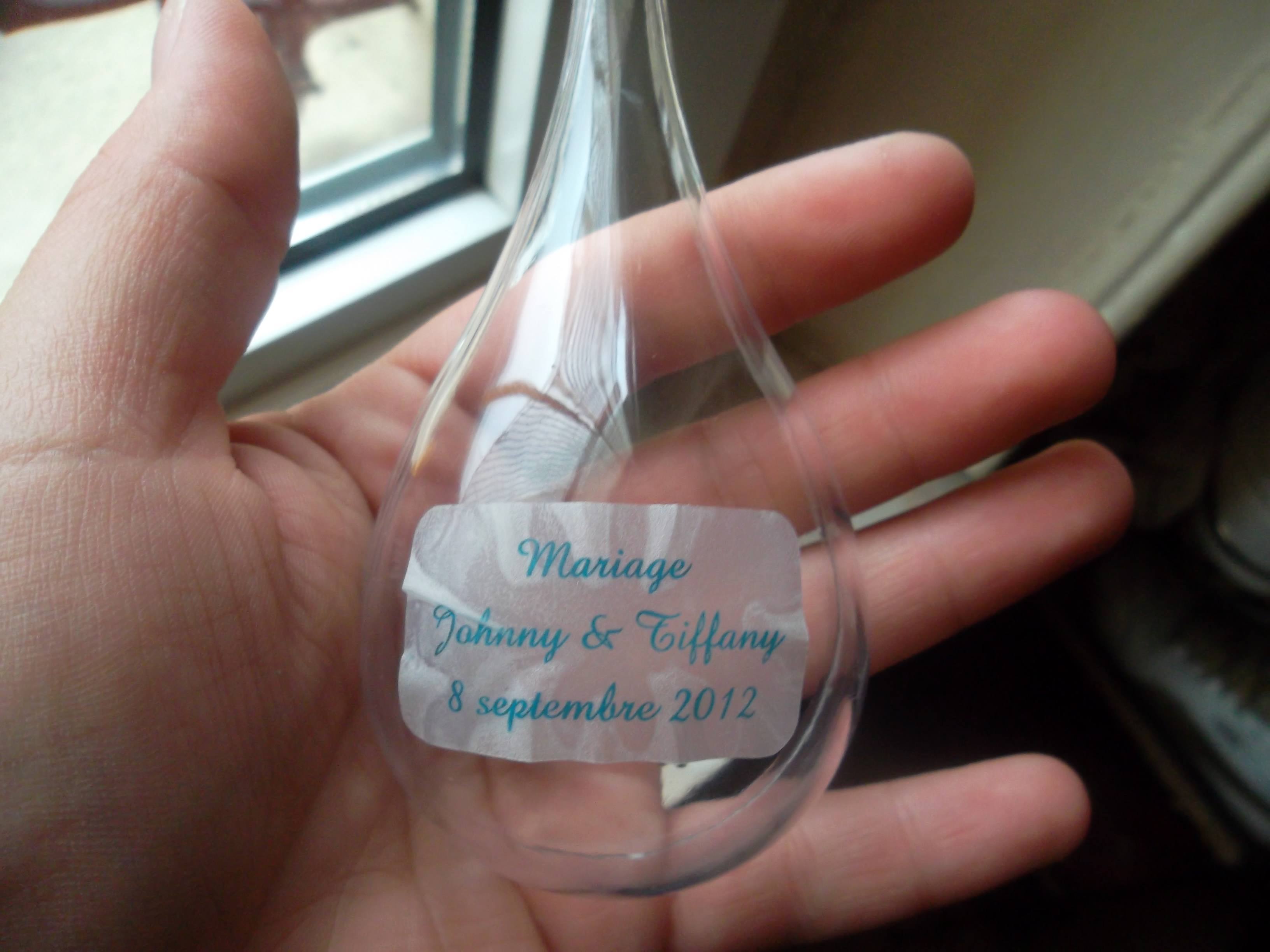 j'ai besoin de votre aide! je prépare mes bombonières pour mon mariage, j'ai des etiquettes transparentes autocollantes, et la bombonière est en forme de goutte ^^