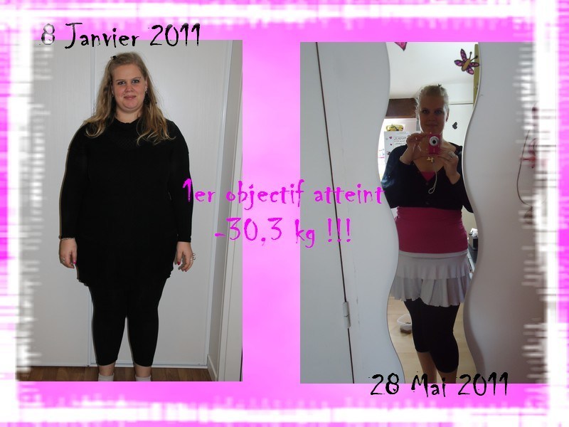 Je suis trop heureuse aujourd'hui!!! Ehhh ouiii -30,3kg ce matin sur la balance!!! Ca y est mon 1er objectif est atteint je suis super contente hihi!! Je met une tite photo pour vous montrer l'évolution hihi :p