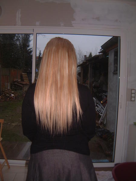 coucou la fille a mis 160 meches de 40 cm avec effet meché 2couleurs différentes:blond patine et blond foncé pour résultat naturel