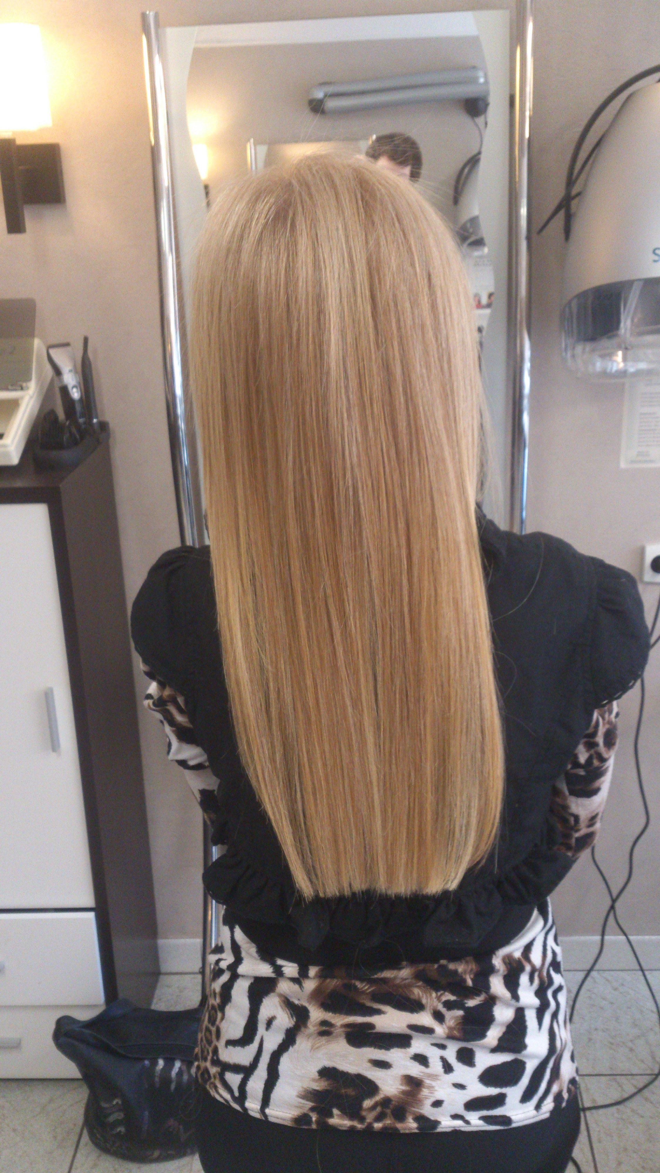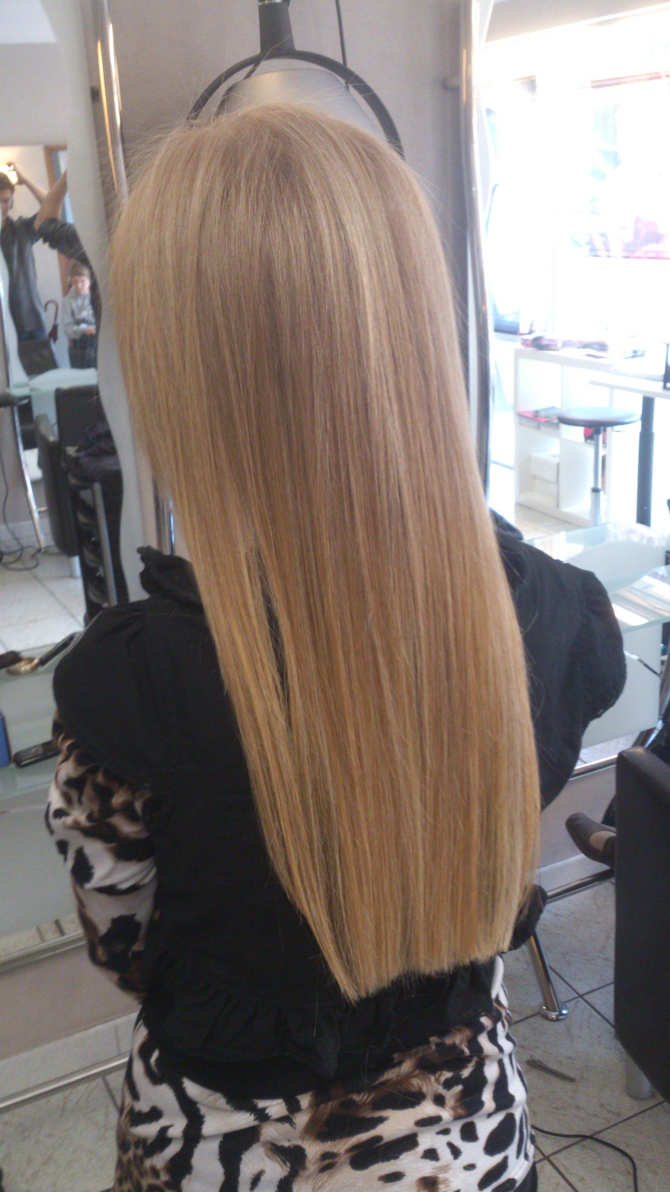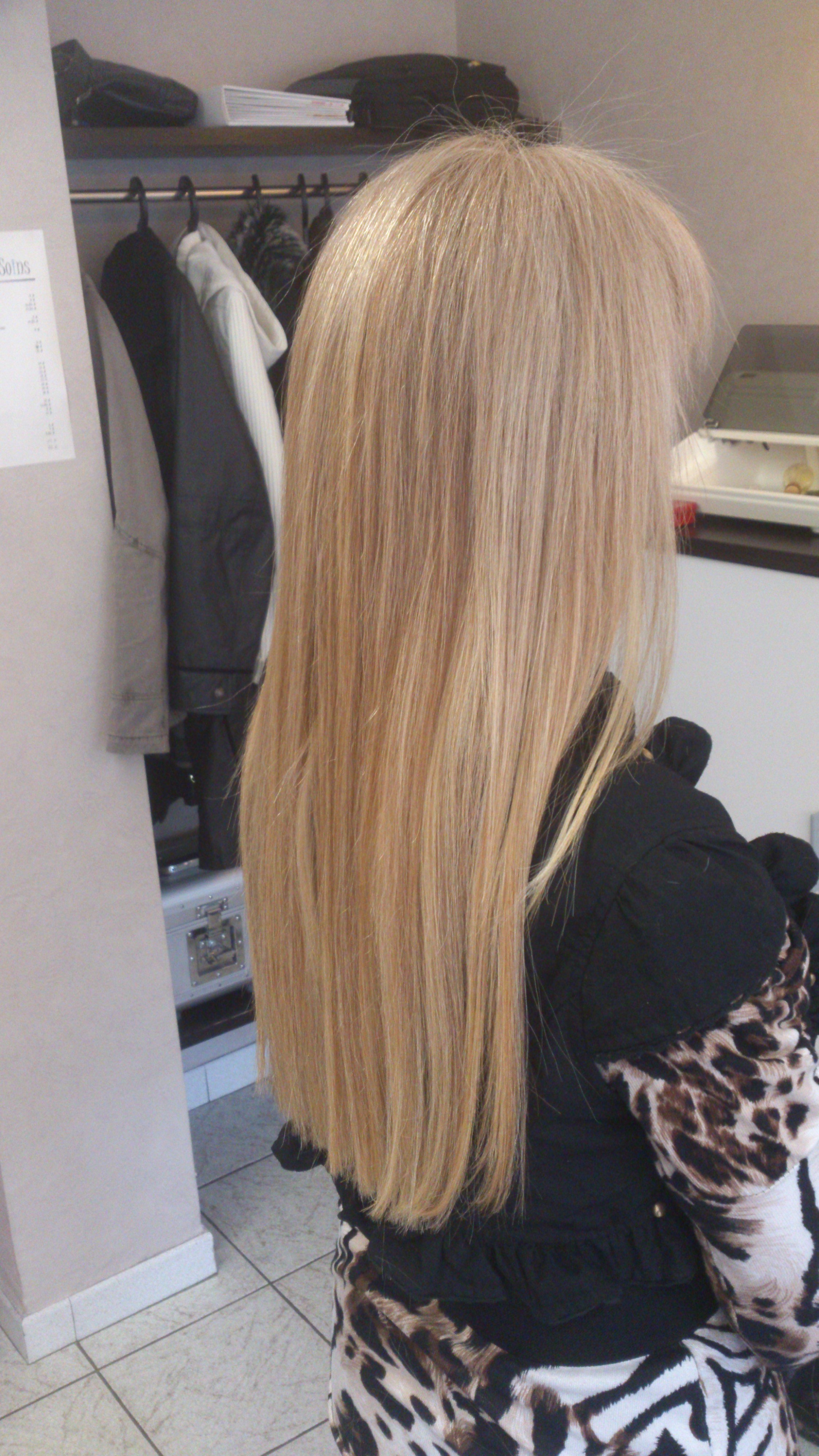 j'ai encore une fois oublie de prendre la photo avant la pose mais le modele a les cheveux tres fins dans les pointes dans masse et a peine en dessous des epaules