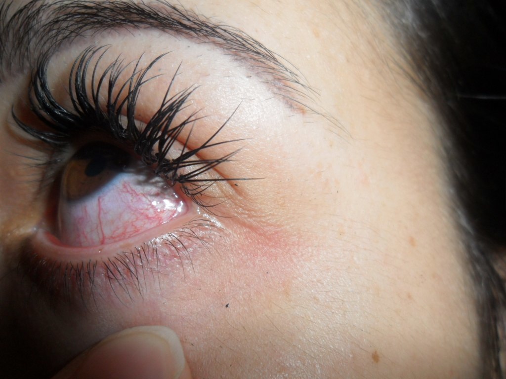 Alors j'ai eu le même problèmes il y a peu. Je me suit fait poser des extensions par une fille et durant la pose je ressentais une douleur à l'oeil. Je lui ai demandé si elle n'avait pas collé mon oeil ou autres et elle m'a dis que non, que cela venait surement du sparadrap que je ne supportais pas, qu'il devait me rentrer un peu dans l'oeil o_O . J'ai résisté à l'envie d'ouvrir l'oeil et je l'ai laissé terminer le travail. A la fin je n'en pouvais plus ! J'aurais du arrêter la fille et ouvrir les yeux pour voir d'autant plus que c'est mon métier et que je sais que cela ne fait pas mal du tout, mais bon je lui ai fait confiance... Résultat en ouvrant les yeux, déception sur la pose (bcp trop épaisses et longues) et j'avais une extension coincé dans l'oeil durant tout ce temps d'où la gêne et la douleur. J'ai eu la même chose que sur la photo de medysis durant 3 jours. J'ai mis du serum pour apaiser. Heureusement que je connais le métier car sinon je pense que je n'aurais plus jamais tentée l’expérience.