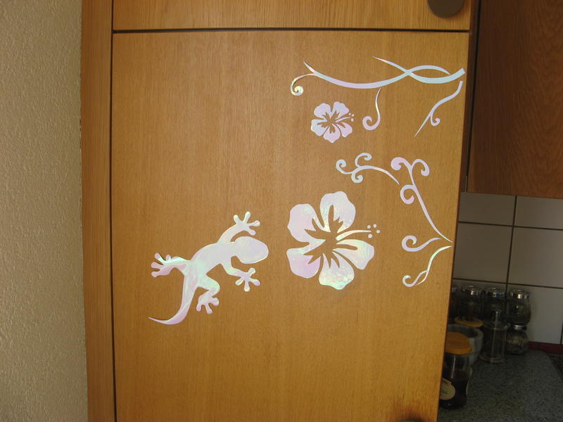 ensuite, viennent les stickers que j'ai fait moi même, c'est sur la porte du frigo. c est un papier auto-collant blanc avec des reflets de toutes les couleurs trop joli !!