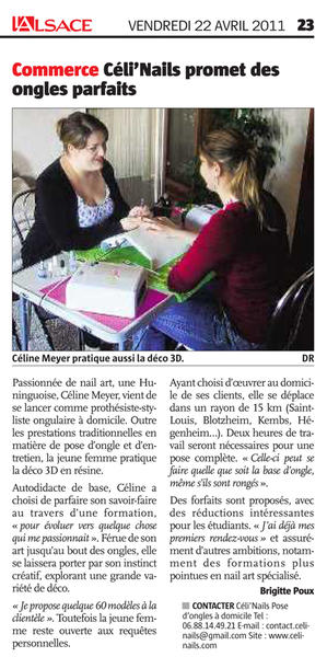 merci mais je suis déjà contente de ce qu'il y a car je n'ai rien payéBonjour ! Très sympa cet article ! Tu t'es bien débrouillée pour l'avoir ! J'espère que tu en tireras les bénéfices avec plein de nouvelles clientes rapidement (Ah ! si tu avais pu mettre une pleine page des photos de ta galerie, ce serait remplissage immédiat de ton carnet de RV ! lol !) Bon courage à toi !