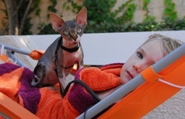 Enfin, Baïkal, sphynx de 1 an et des brouettes. Glue comme jamais, charmante comme tout, joueuse, bonne patte. Surnommée "petite crotte" en raison de sa petite taille par rapport aux 2 autres (avec ma fille sur la photo).