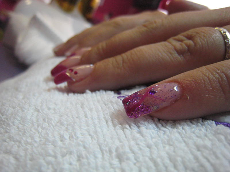 Main gauche (colorée): pose faite sur elle même. Elle n'avait jamais fait de pose, je suis contente de son travail.