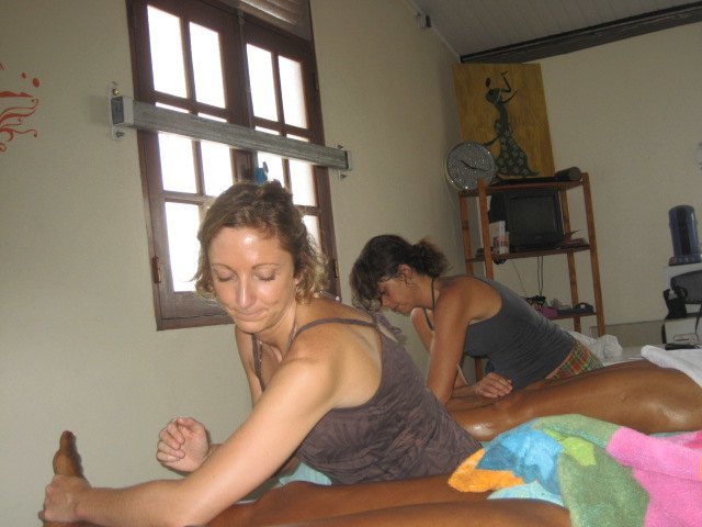 Les gestes et postures sont montrés par petites séquences sur un des participant, pis travaillé ensuite deux par deux, chacun peut pratiquer et recevoir le massage jusqu'à l'apprentissage du protocole complet.