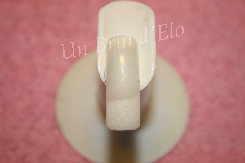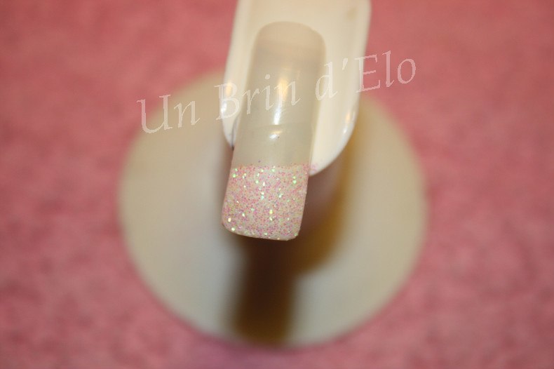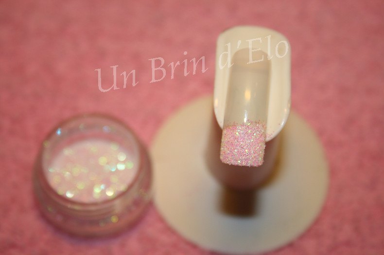 PHOTO 4 : Ajouter les paillettes en poudre dessus à l'aide du repousse cuticule, (mettre le pot en dessous pour récupérer le surplus de paillettes afin d'éviter le gaspillage) cataliser.