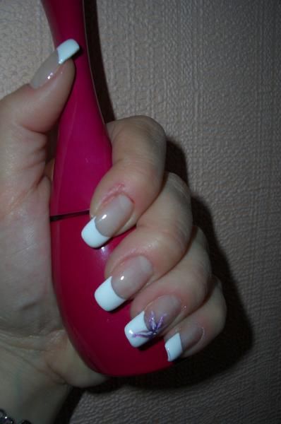 Déco gel blanc + butterfly + paillettes mauves et strass.