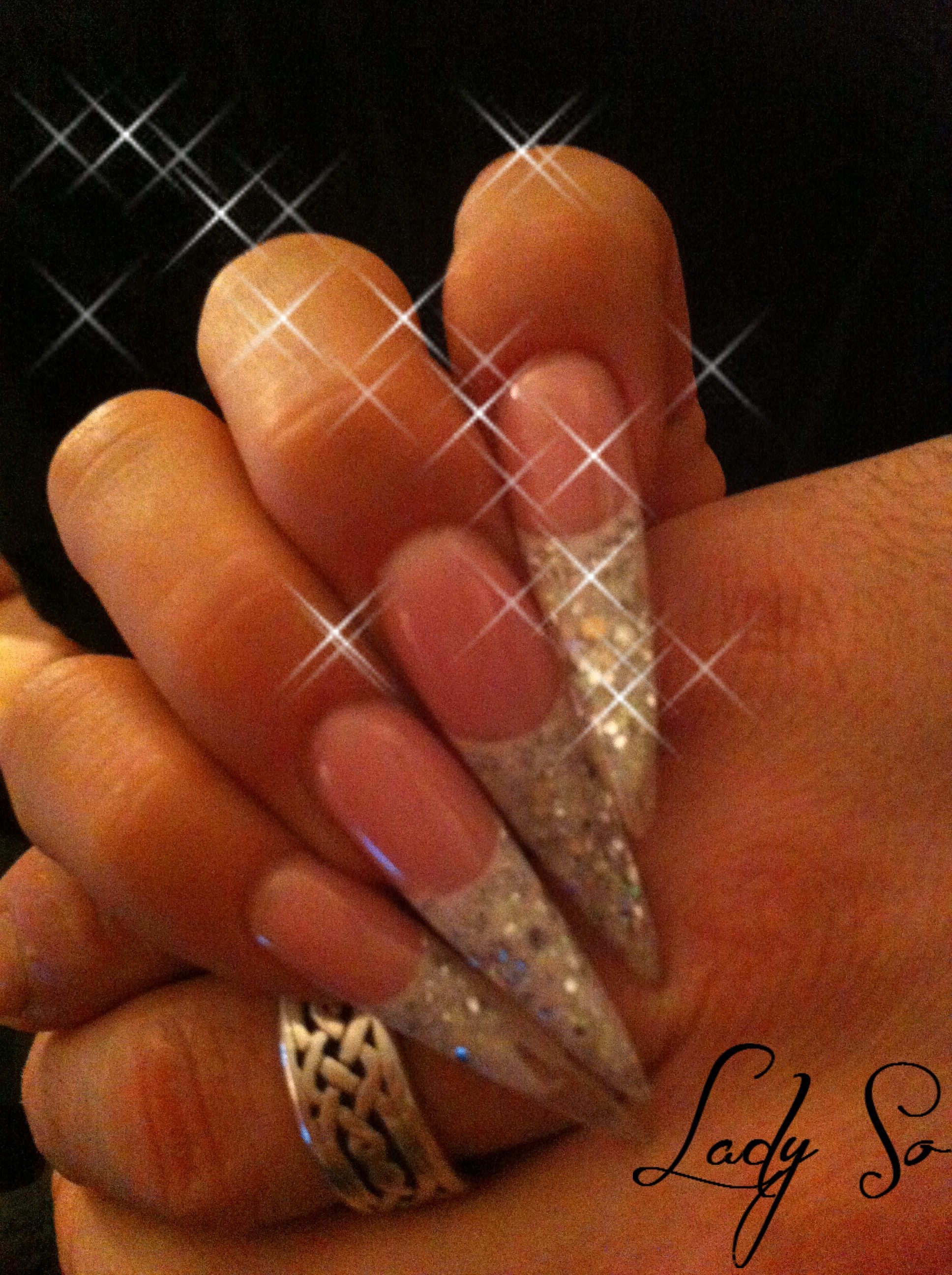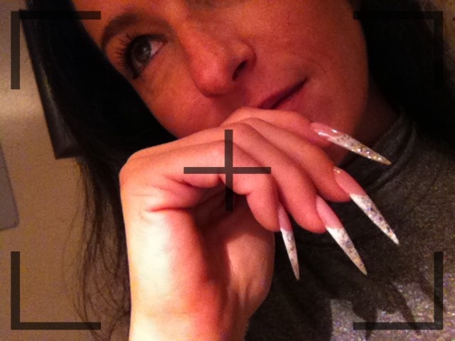 Bonjour les filles, j ai voulu essayer des stilettos "courts", autrement dit qui restent portables, l effet est certe moins bluffant que sur des longs ,mais ils piquent donc ce sont bien des stilett!!! Par contre aprés avoir pris des 10è de photos :D , ils n apparaissent toujours pas aussi fin et pointus, allez comprendre!! Donc je vous les met comme ça, toujours sur ma main droite, la gauche fait la grève, tout gel , french blanche, paillettes blanche,et feuille et nfu argent! (petit effet stalactite sur le ptit rikiki)