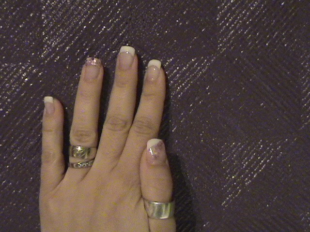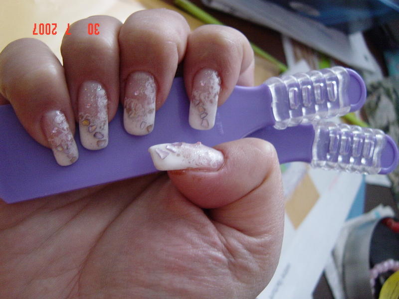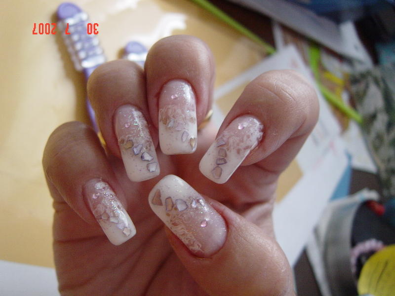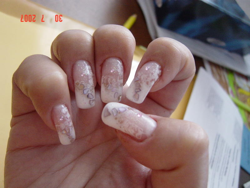 Alors voila fini le rouge, je suis revenu plus dans le romantique avec blanc étirer, fond paillette rose, strass rose et nacre mauve.