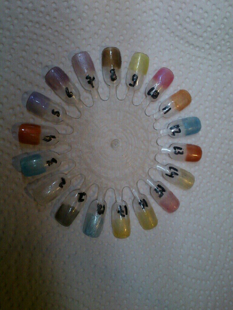 V.v a dit:Voilà les photos, c'est très très dommage parce que sur les photos ça ne rend pas du tout, on a l'impression que les couleurs sont bien donc j'en ai ajouté 2 avec un ongle en dessous pour que vous vous rendiez compte à quel point c'est transparent! sachant que sur le présentoir la couche est épaisse, je pense que pour avoir un tout petit peu d'opacité il faudrait l'utiliser en gel de construction!