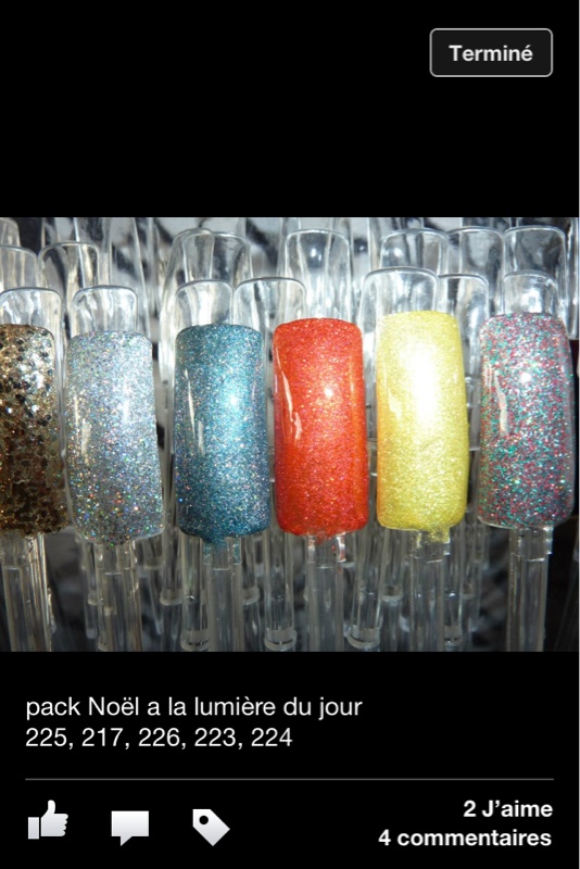 Coucou les filles j'ai reçu mon pack de Noël, sublime, je n'ai pas pu attendre donc j'ai essayé! Bon celui utilisé est le numéro 044 il ne fait pas parti du pack mais très joli aussi! Je ne suis pas couleur verte mais celui est couleur sapin avec des petites paillettes que l'on ne voit pas sur la photo hélas!